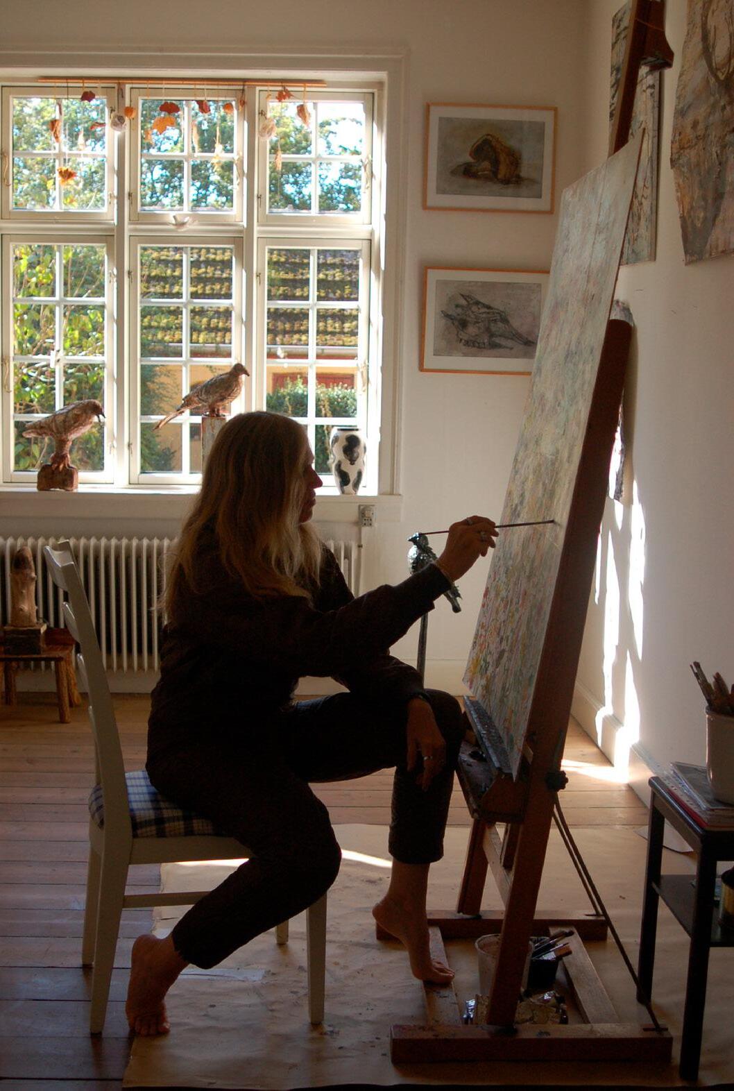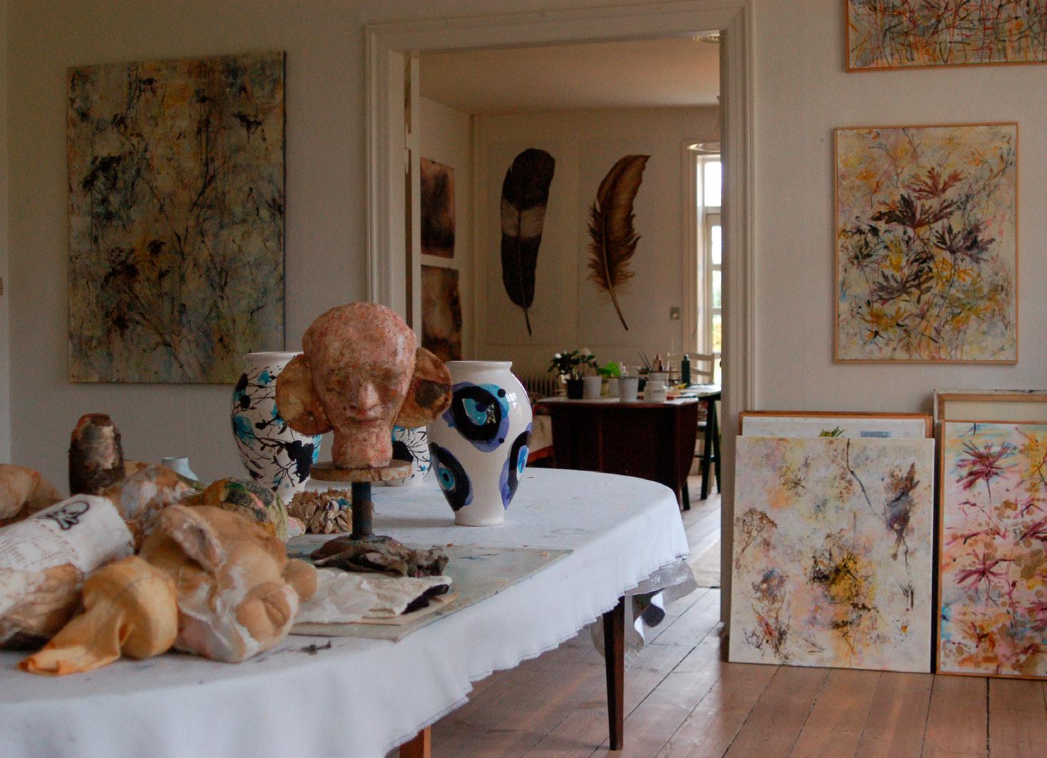 Jeg har atelier på Stevns, hvor jeg bor på en gammel præstegård omgivet af marker, stynede piletræer og levende hegn mellem jordlodderne. Om sommeren arbejder jeg med døre og vinduer vidt åbne, så det gode lys kan strømme frit ind i de gamle højloftede stuer, der er indrettet til atelierer.