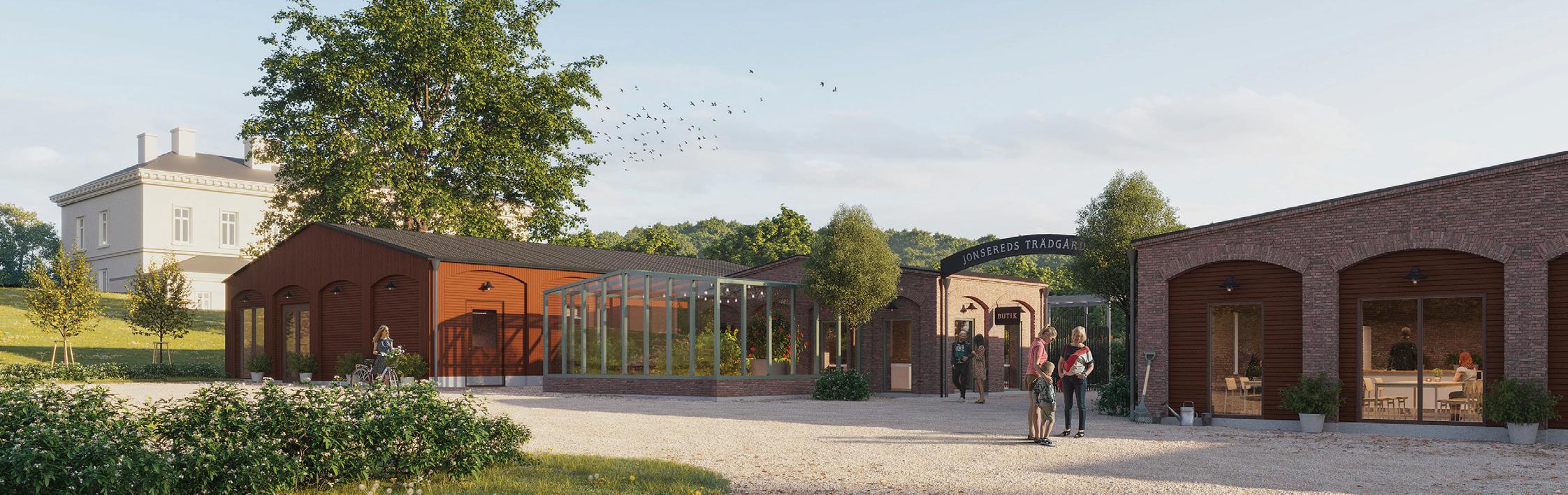 I höst har vi därför börjat riva de befintliga paviljongsbyggnaderna. Med tiden ska de ersättas av nya permanenta byggnader, som är mer funktionella och som utseendemässigt passar bättre in i den unika miljön. Kaféet beräknas vara klart till hösten 2023 och de övriga byggnaderna, trädgårdsbutik och personallokaler, under hösten 2024. Förslag på utseende och slutgil-