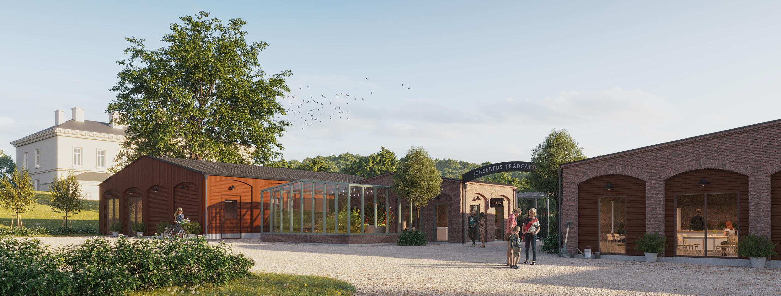 De nya trädgårdsbyggnaderna, sett från Jonsereds Herrgård.