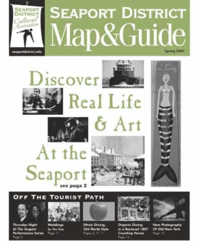 Seaport District Map & Guide, a tabloid newspaper for New York’s Seaport District Cultural Association, promotes