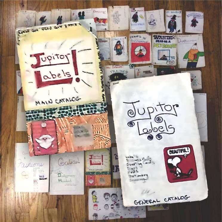 Left-hand page: “Jupitor” label catalogs and comic books that I made in elementary school. I had big ambitions, so I named my company after the biggest thing I could think of.