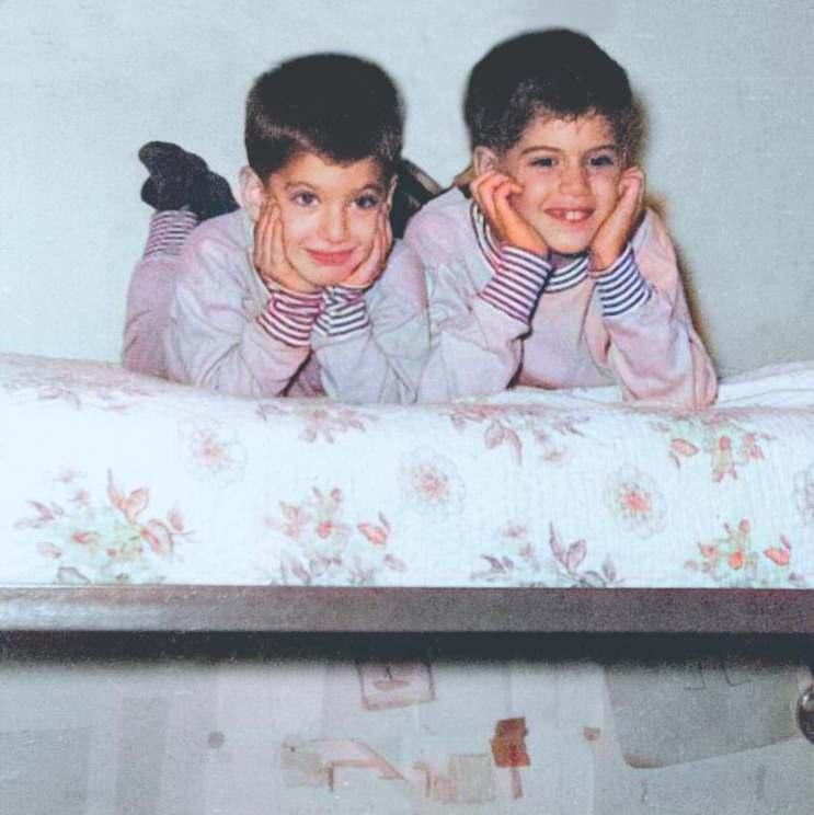 Left-hand page: My brother, Don (right), and I on top of our bunkbed. I was five years old. Some of my art is taped to the wall on the bottom bunk. Don grew up to be a successful singer-songwriter and music producer.