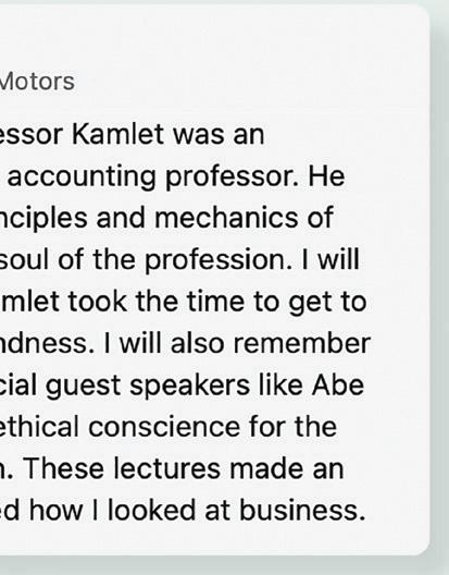 Since my first class with him, I could tell he genuinely cared about his students and the SOM community as a whole. He always challenged us to think outside the box and motivated us to look at things from different perspectives. He provided continuous support and guidance to the management consulting group student organization that I was a part of by helping us develop and execute case competitions for hundreds of students. I am extremely grateful for everything I learned from him.