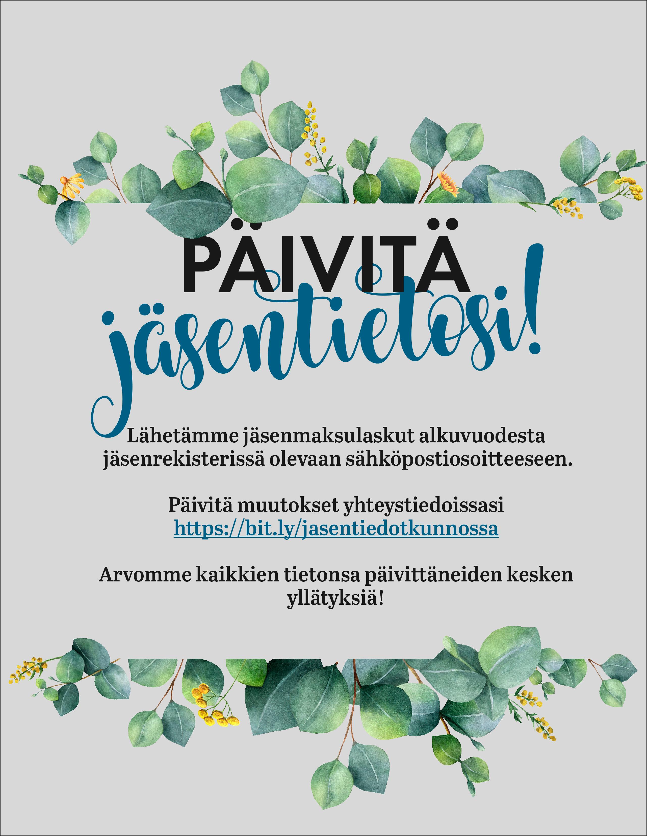 Nyt kiiruusti https://bit.ly/jasentiedotkunnossa -osoitteeseen päivittämään mahdolliset muutokset yhteystiedoissasi! Arvomme kaikkien tietonsa päivittäneiden kesken yllätyksiä!
