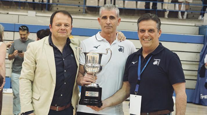 De izquierda a derecha Antonio Vos, Ildefonso García y Rafael Ramírez, directivos del Club Voleibol Leganés, con el trofeo Superliga Masculina 2.