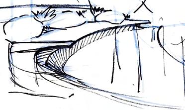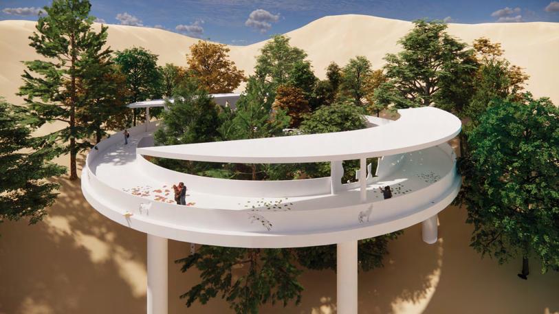 Original concept of elevated circular structure nestled in a canyon surrounded by forest.