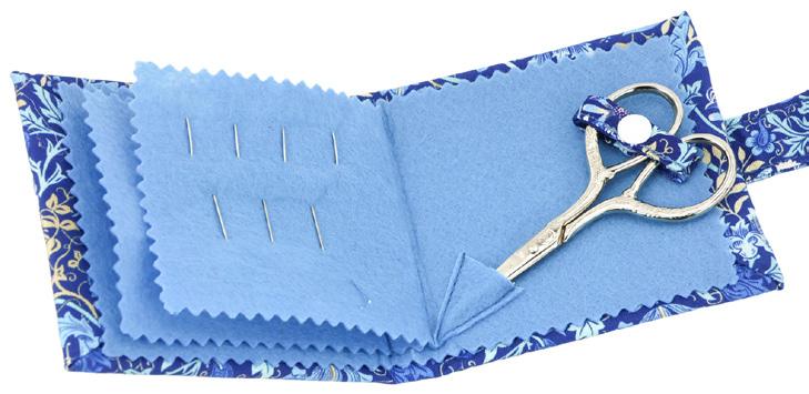 Compact needle case with soft felt pages for storing pins. Includes: needles, safety pins, plastic head pins, and scissors