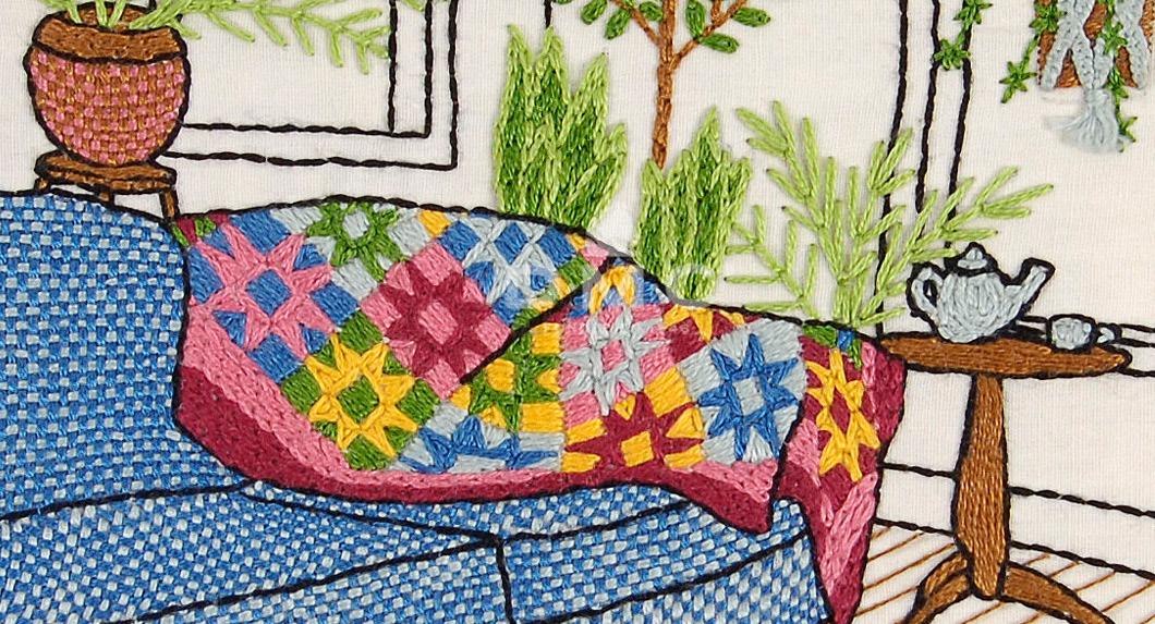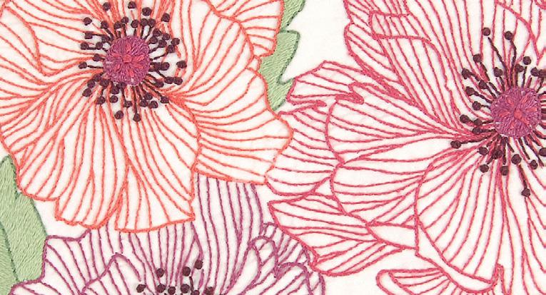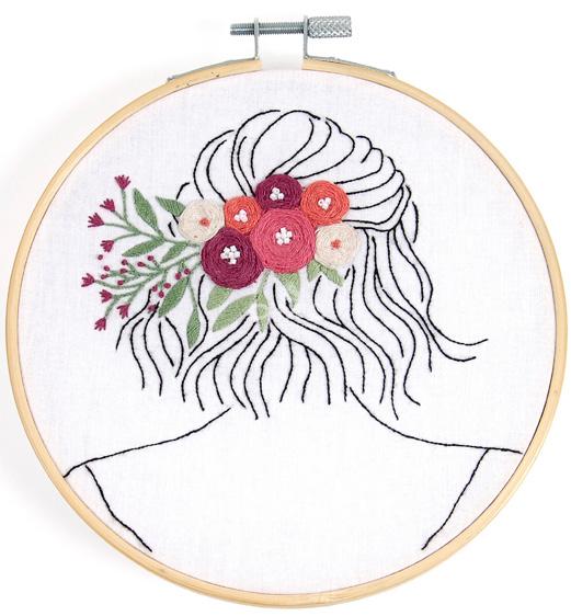 Line drawing figures decorated with florals aredesigned by Joanna Hateley. The line portrait is worked in stem stitch and the flowers and leaves created with a combination of long and short stitch, satin stitch and french knots.