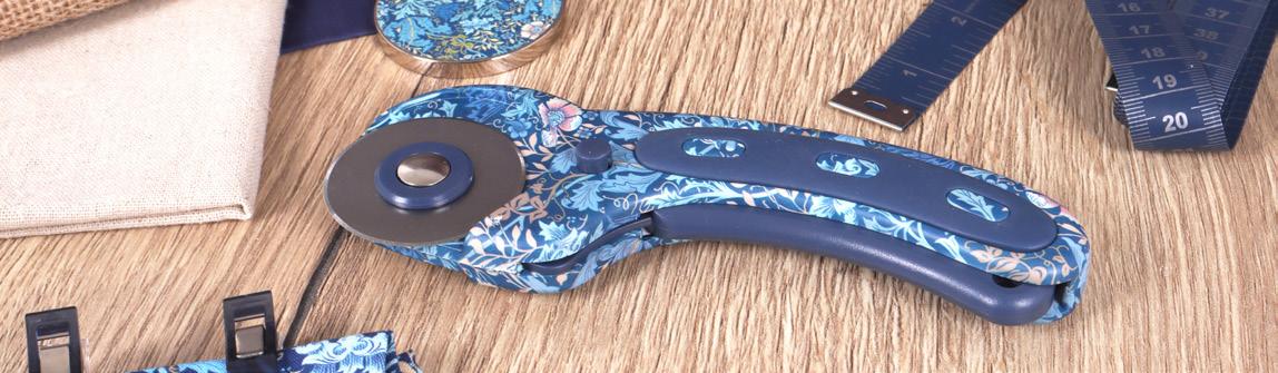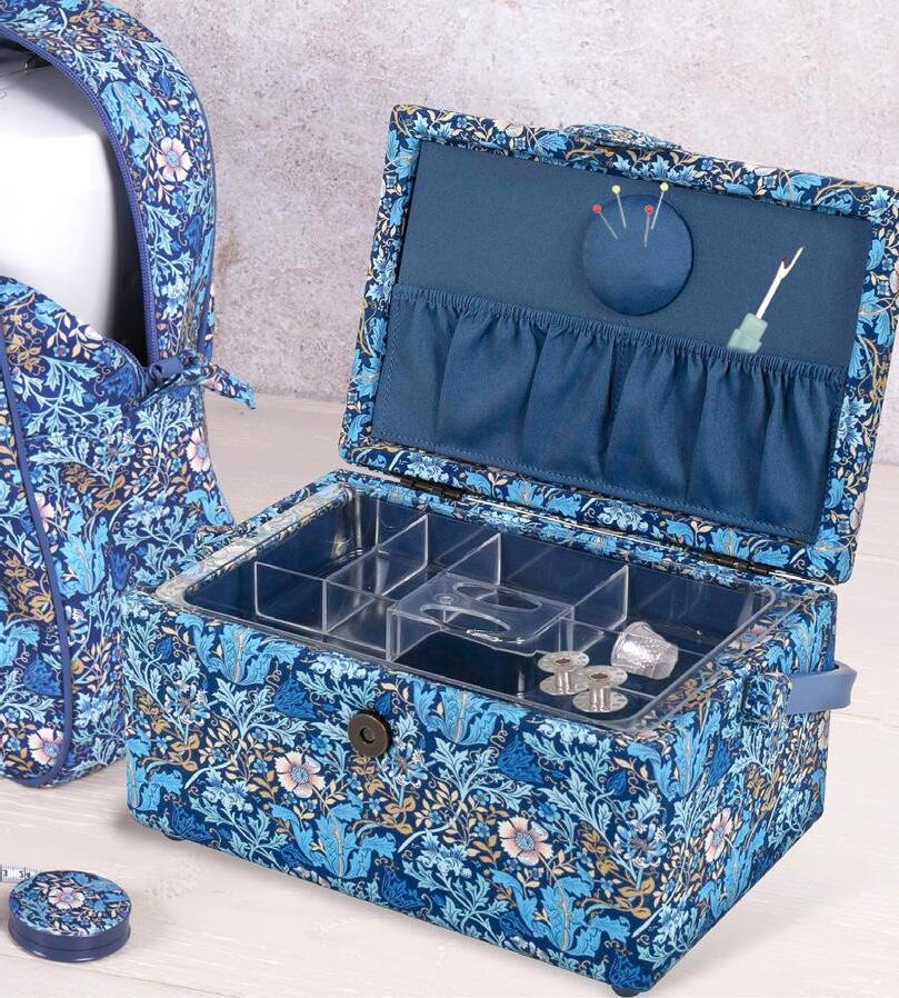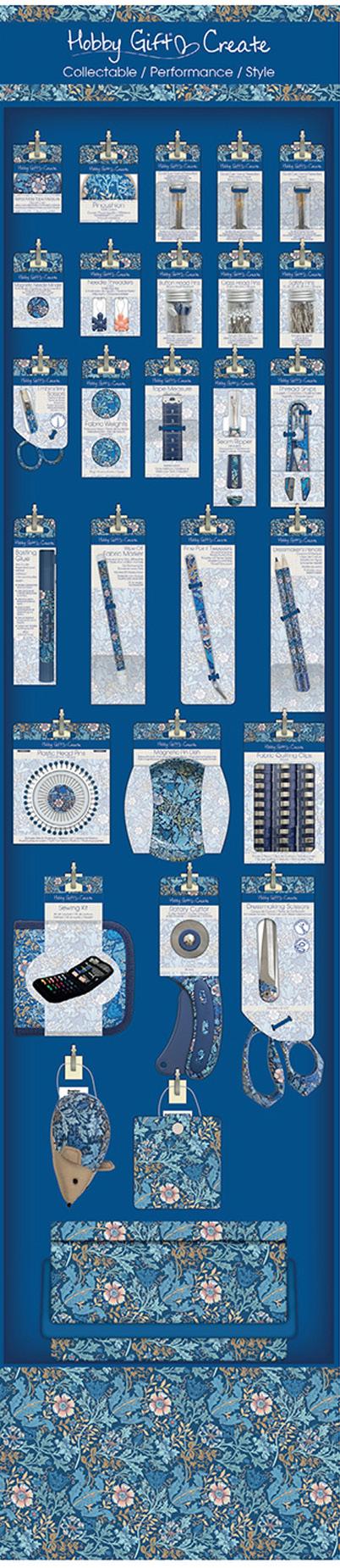 Hobby Gift’s NEW haberdashery accessories that feature a woodblock Arts & Crafts inspired printed design in bold blue tones. Products are in a plastic free hang-sell packaging with coordinated packaging design