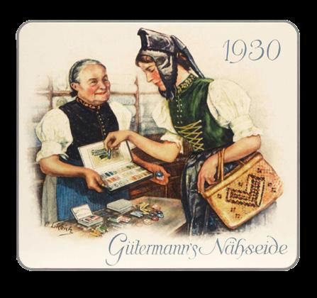 Storage Box with nostalgic advertising motif, containing spools of Sew-all Thread 100 m. Sew-all Thread, the right thread for all fabrics and seams.