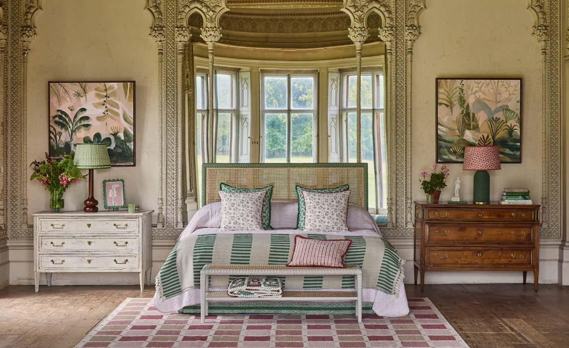 Pyaz Wooden Lamp - $395, Shatranj flatweave rug - $2,995, Pavilion Wooden Headboard - $1,895, Nandalur Quilted Bedspread - from $795, Ogee Block Printed Cushion - $245, Khiva Block Printed Floral Cushion - $245, Dopatti Throw - $385, Pavilion Wooden Ottoman - $1,195, Patti Block Printed Cushion - $225, Rattan Table Lamp - $295, Scallop Paper Printed Lampshade - from $195