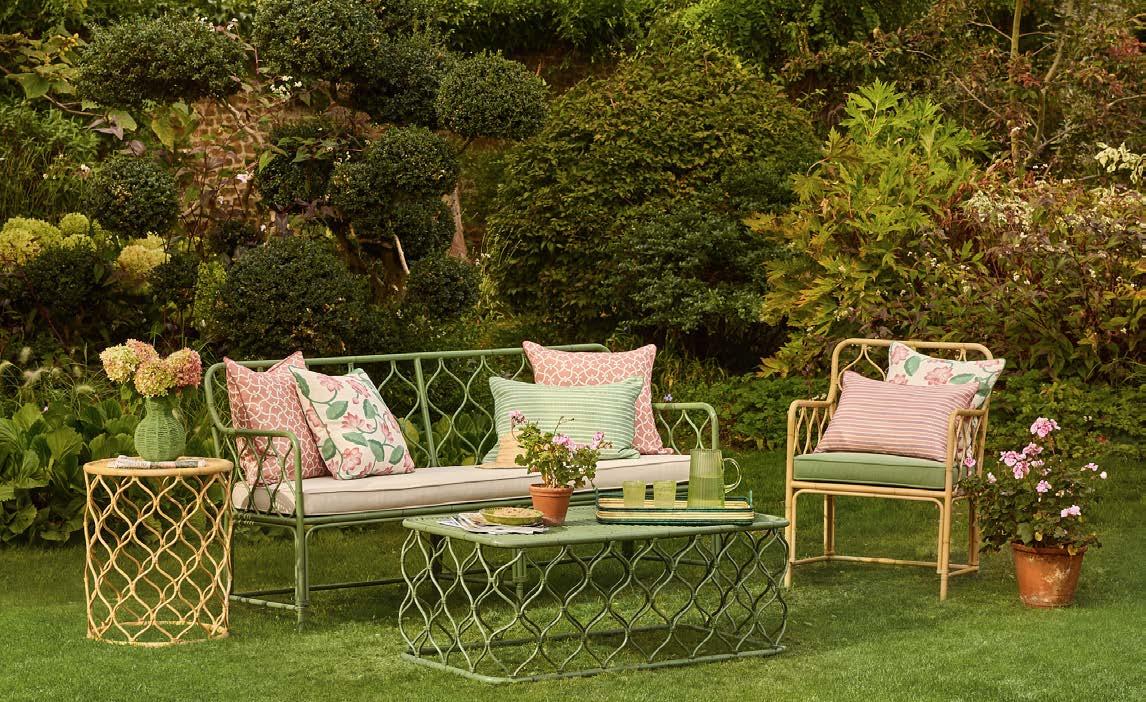 Curato Garden Side Table - $950, Curato Garden Sofa - $2,495, Ogee Outdoor Cushion - $245, Lotus Outdoor Cushion - $225, Patti Outdoor Cushion - $195, Curato