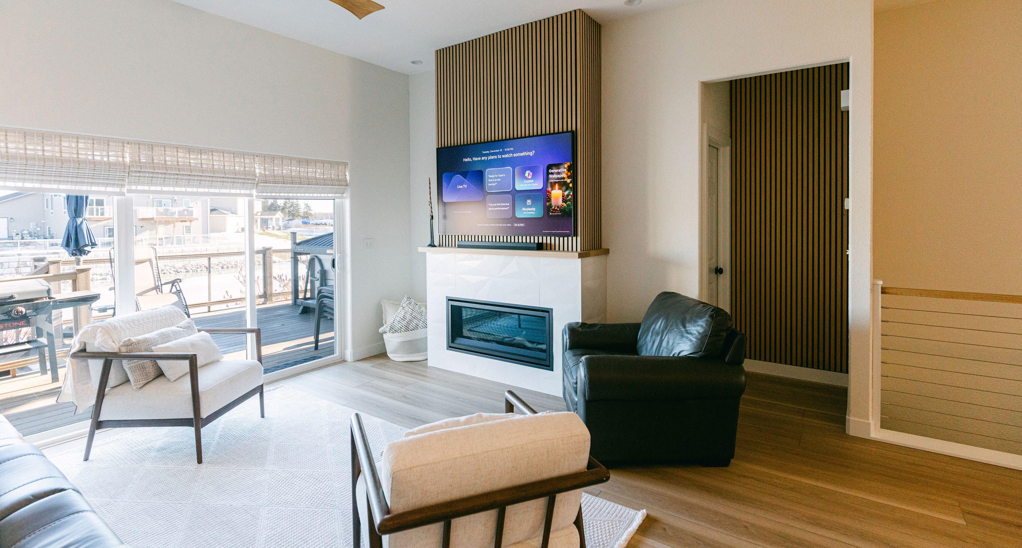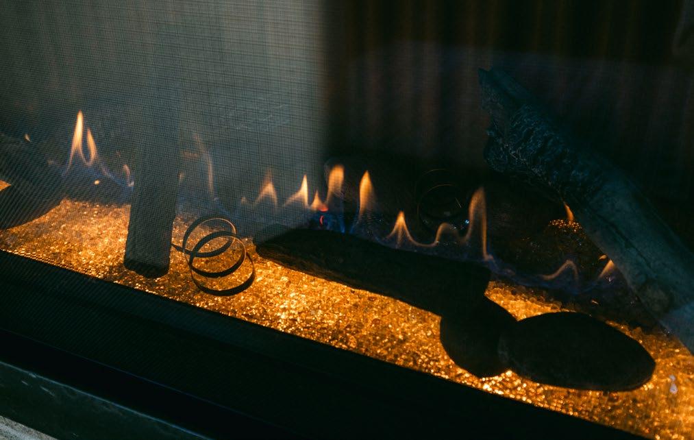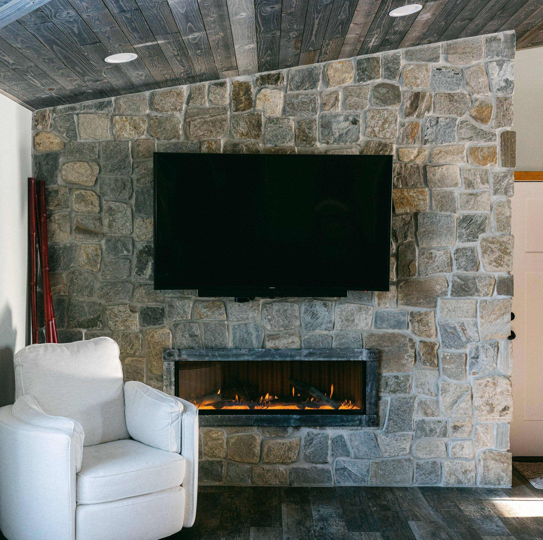 In the second home, Coldspring installed a 48-inch Boulevard linear gas fireplace by White Mountain Hearth. Featuring a hammered iron forged frame in pewter, a bronze liner, broken fire glass, and underbed halogen lighting, the fireplace blends rustic character with modern polish. “Once the weather cooled off it’s been on every day,” the homeowner said. Having owned gas fireplaces before, she knew immediately it was the right fit: “I loved the forged look on the outside. We were going rustic in a sense but not overly, and this fireplace complemented the rest of the house perfectly.”