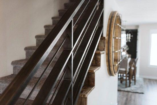 A million different details make this home truly unique. The statement tree wall is composed of trees brought over from Lindsey’s childhood home and her family farm. “We wanted to bring Minnesota home,” describes Lindsey. “Our motto is home is on both sides of the river because I am from Minnesota, and he’s from North Dakota.” Barnwood from a collapsed barn on Lindsey’s family farm was used to frame mirrors, a fireplace, and as the material for a shiplap wall. When it came to finding the perfectly rusted metal, it was impossible to find truly rusted metal that was not rotted or moldy. Todd’s brother Craig, project manager at Sparling Construction, bought new metal and tried to rust it himself. After trying just about everything, they bought vinegar, paprika, chili powder, created a rust-like powder, and lacquered it on the metal, creating a rust look with just a few simple ingredients. The different beams throughout the home were hand-crafted by them. Everything is well-built, high-end, and often custom-made. “A lot of craftsmanship went into this home,” describes Todd.