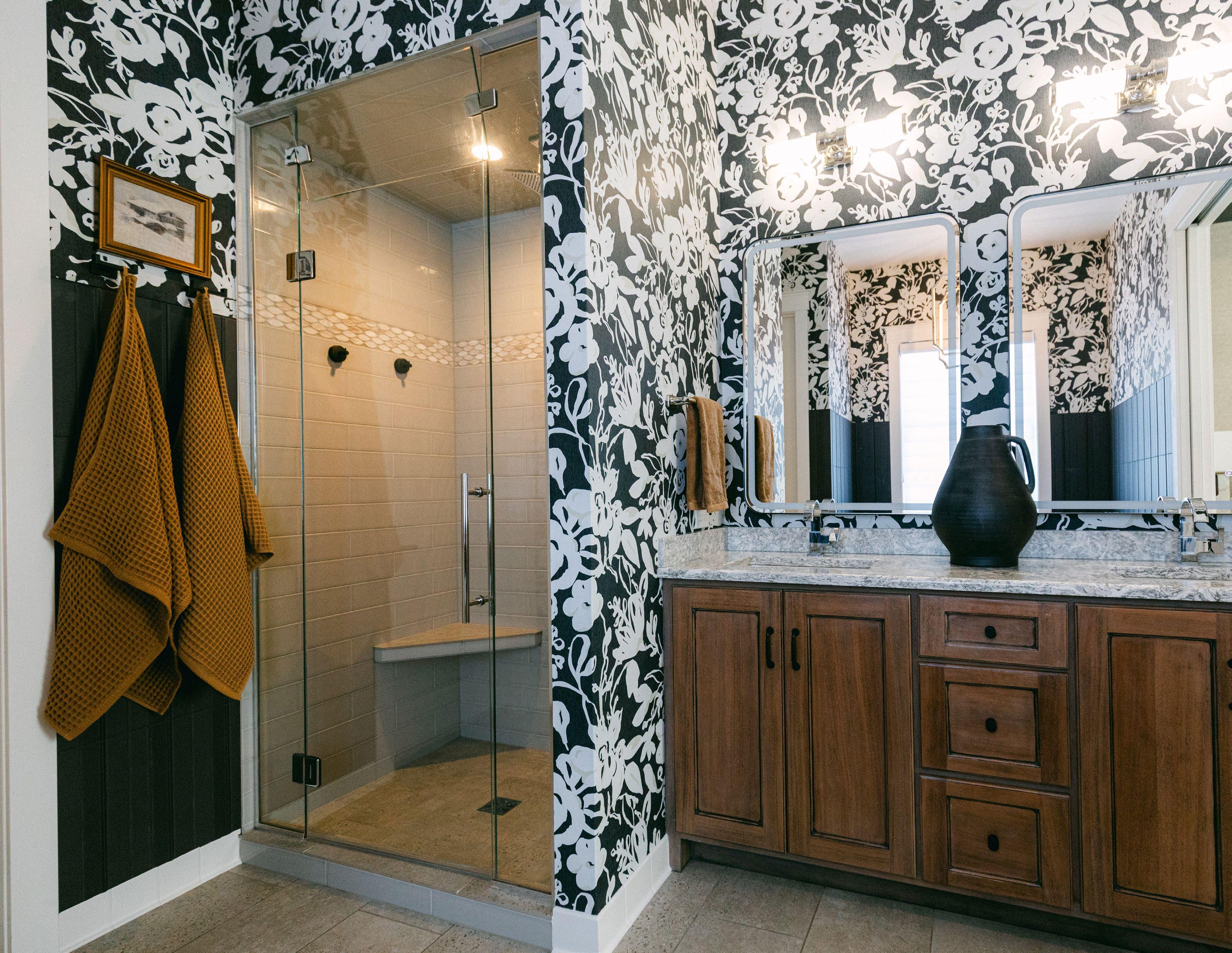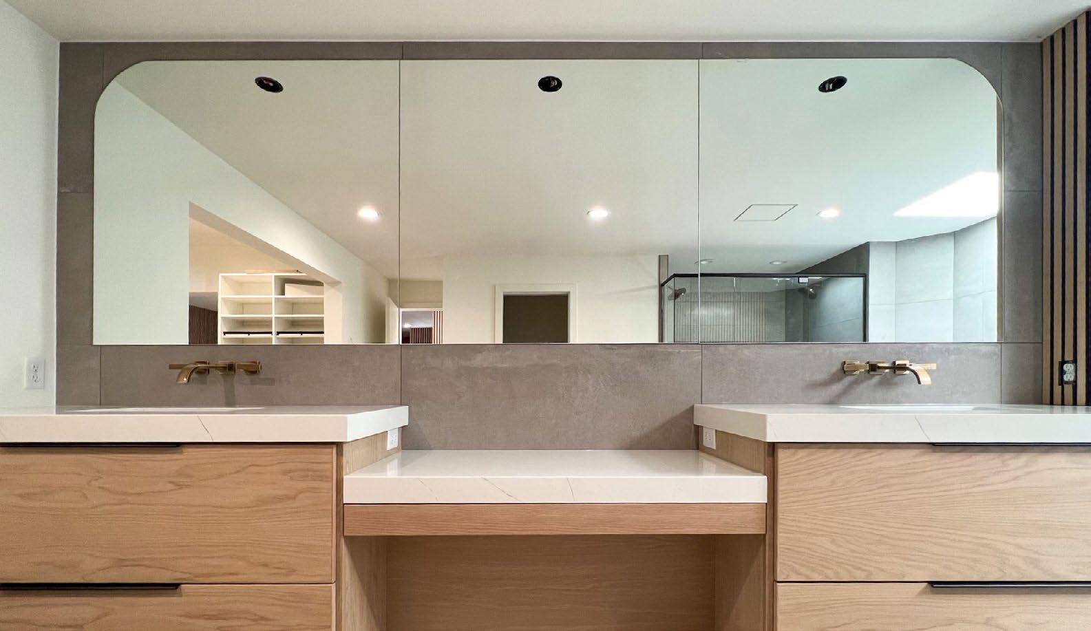 Another cosmetic change the homeowner made was covering up a dated wall with arched built-in mirrors. “We called it the confessional because that’s what it reminded us of,” jokes the homeowner. To compromise on budget and design, the homeowner designed a slab wall that covers the pre-existing wall for a statement piece that better reflects her personal style.