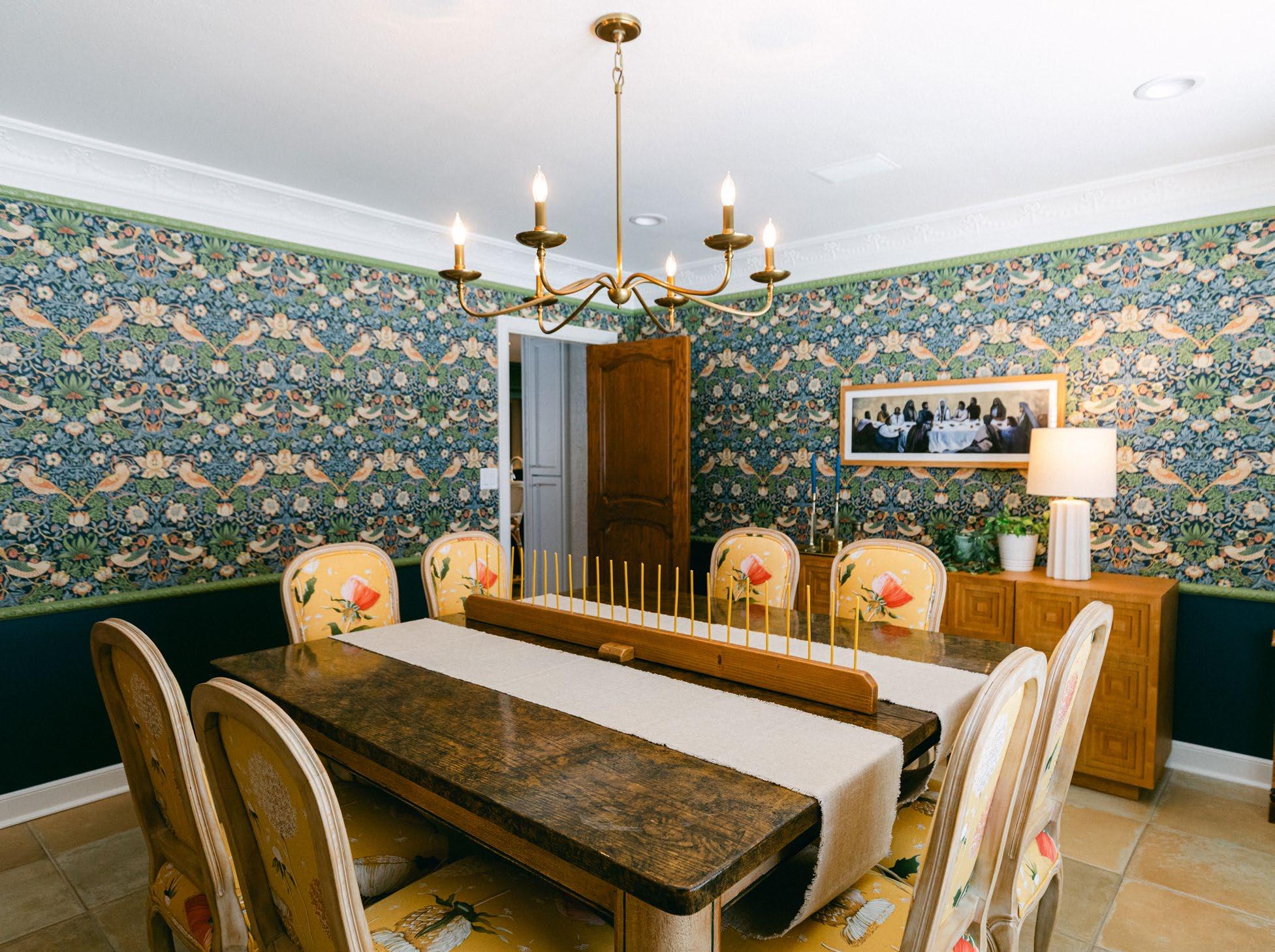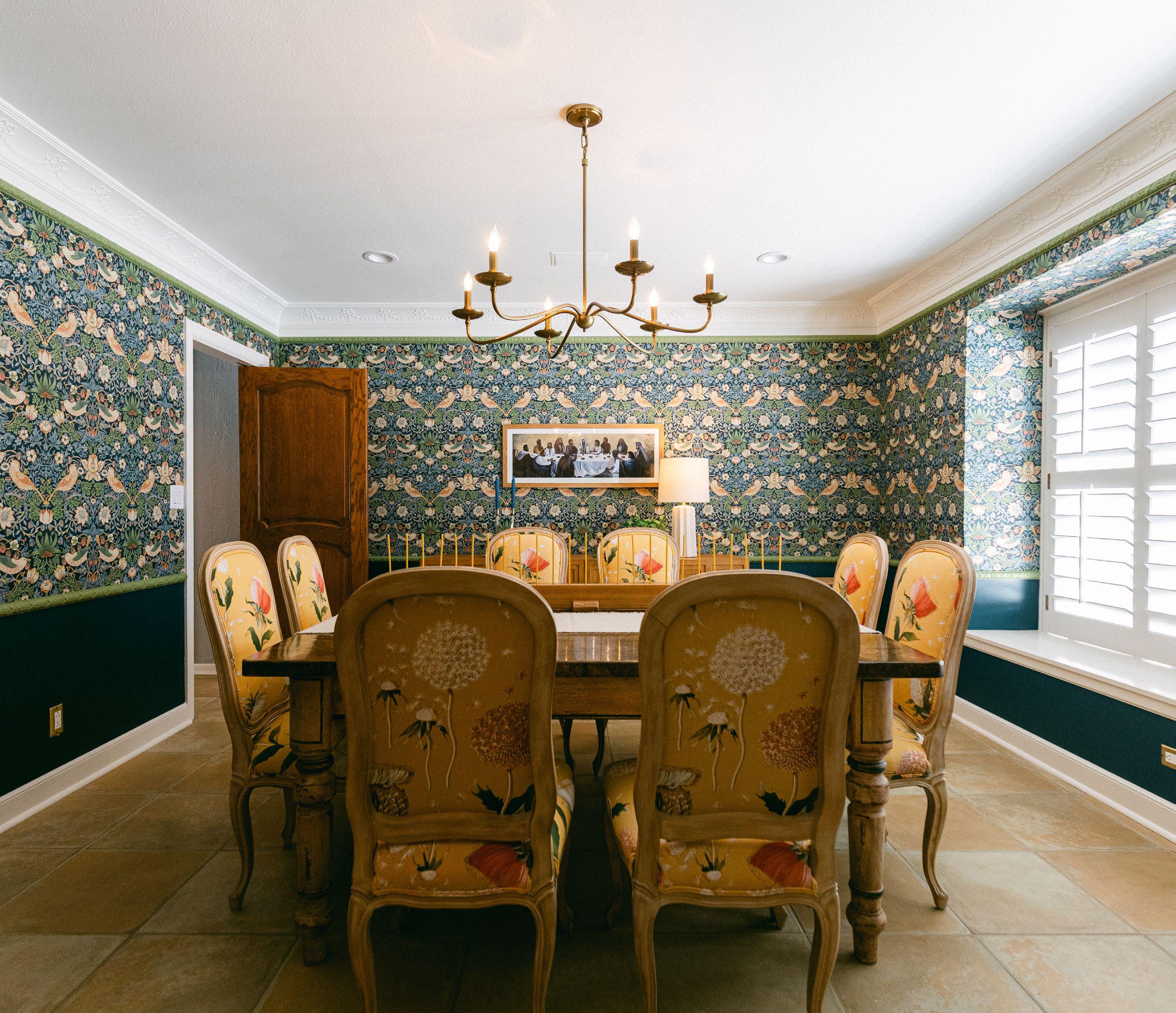 Over 20 different Sherwin Williams colors were used to update spaces, creating an elegant vibrancy. In the dining room, Jean put up a wallpaper that pulls together all the various paint tones into one statement piece, and then used the kitchen and dining room as inspiration for the rest of the home.