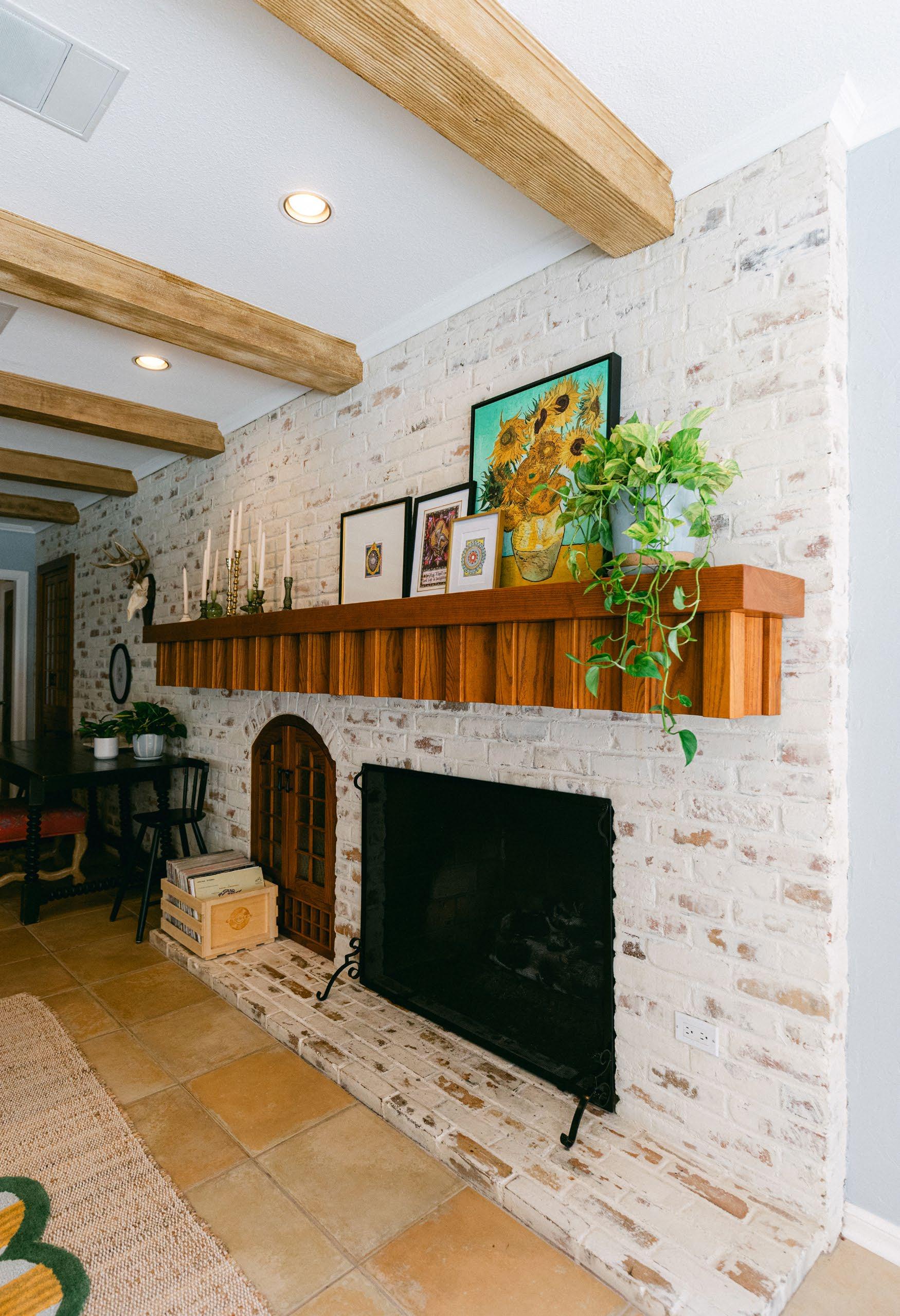In the living room, Bridget renovated the existing fireplace to make it fit her style better. Originally, the mantel sat 14 inches higher. Bridget pulled it down, rearranging the stonework, and repainted it. She also