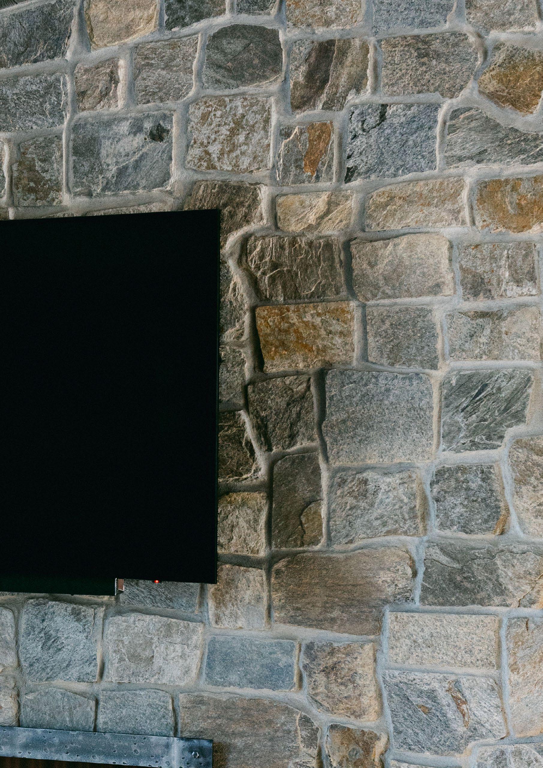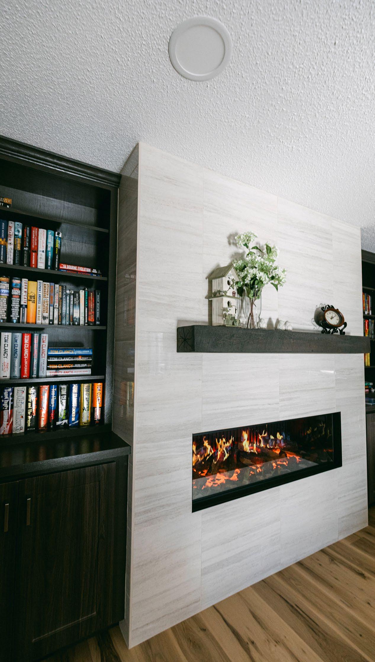 Concrete, which can be installed at virtually any height. “We looked at a lot of electric fireplaces, and this was by far the best one we found as far as realistic flames, the different options you have with it. This was the best one we came across, I don’t even think it was close,” adds the homeowner.