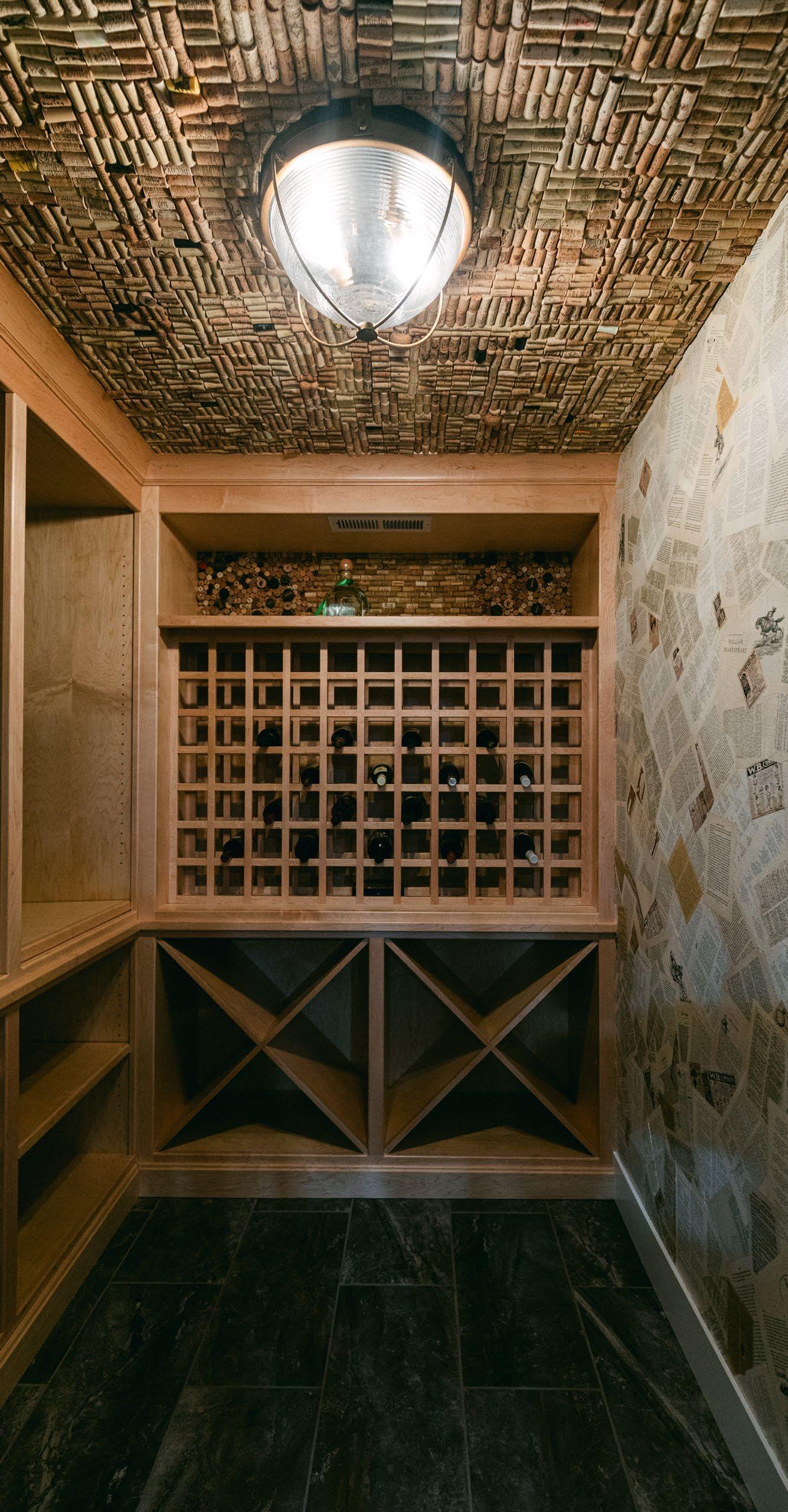Next to the bar is a cleverly hidden wine room. Wine corks line the ceiling, many of them contributions from previous clients to personalize the space. On the wall is a mural of old sheets of paper Bridget found in books she thrifted. “I filled it with a lot of meaningful things,” she explains.