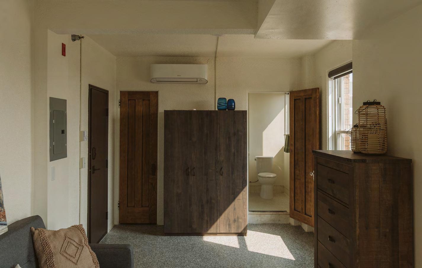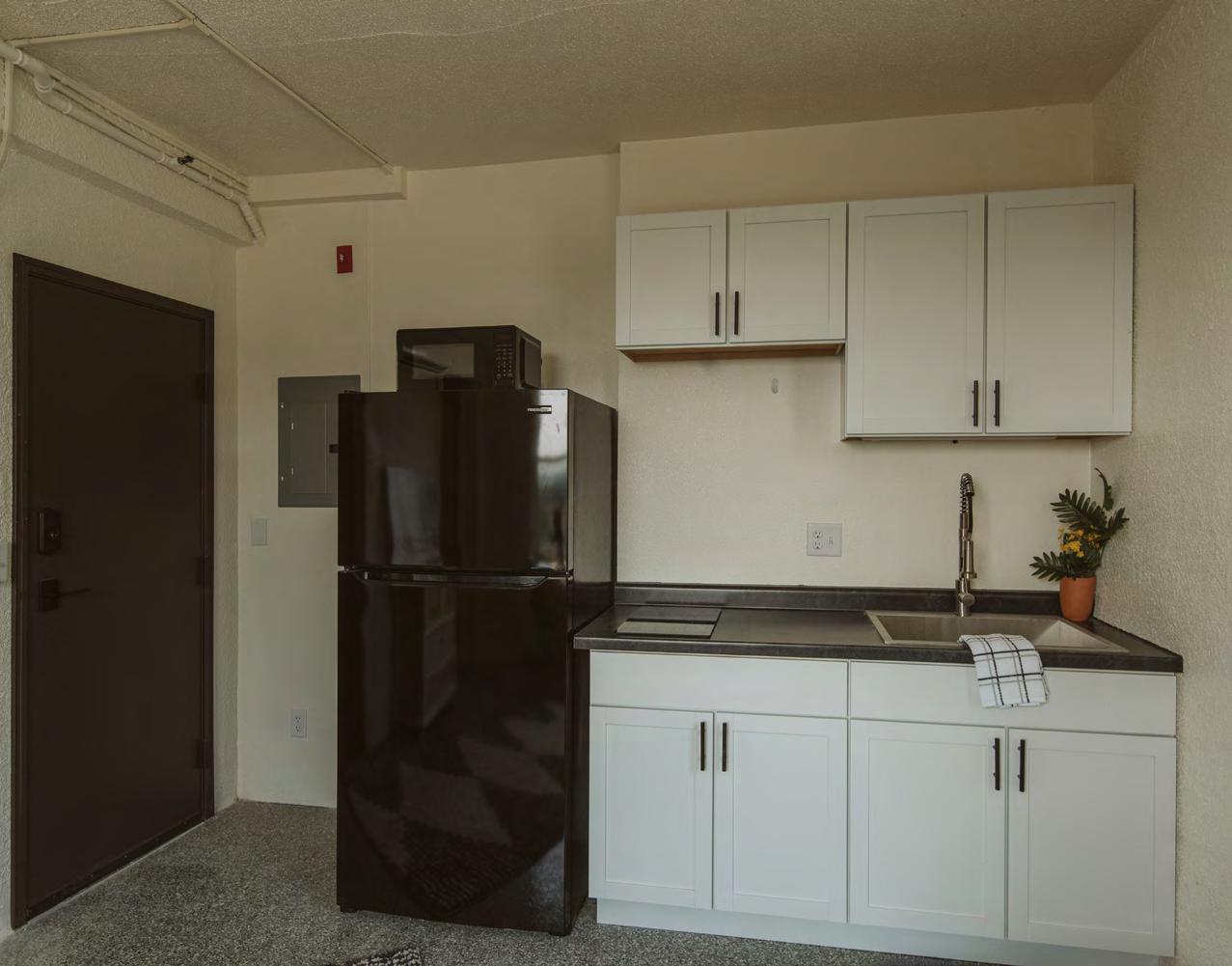 The Prince has 74 micro-apartments available for rent. They are newly renovated and completely updated. Rolf describes, “We changed out absolutely every bit of mechanical stuff everywhere. Every apartment has its own water heater, so you never run out of water. New heater, new electrical, high-efficiency heating and air.” Additionally, the plumbing is all new, and all the apartments come with their own microwave and fridge.
