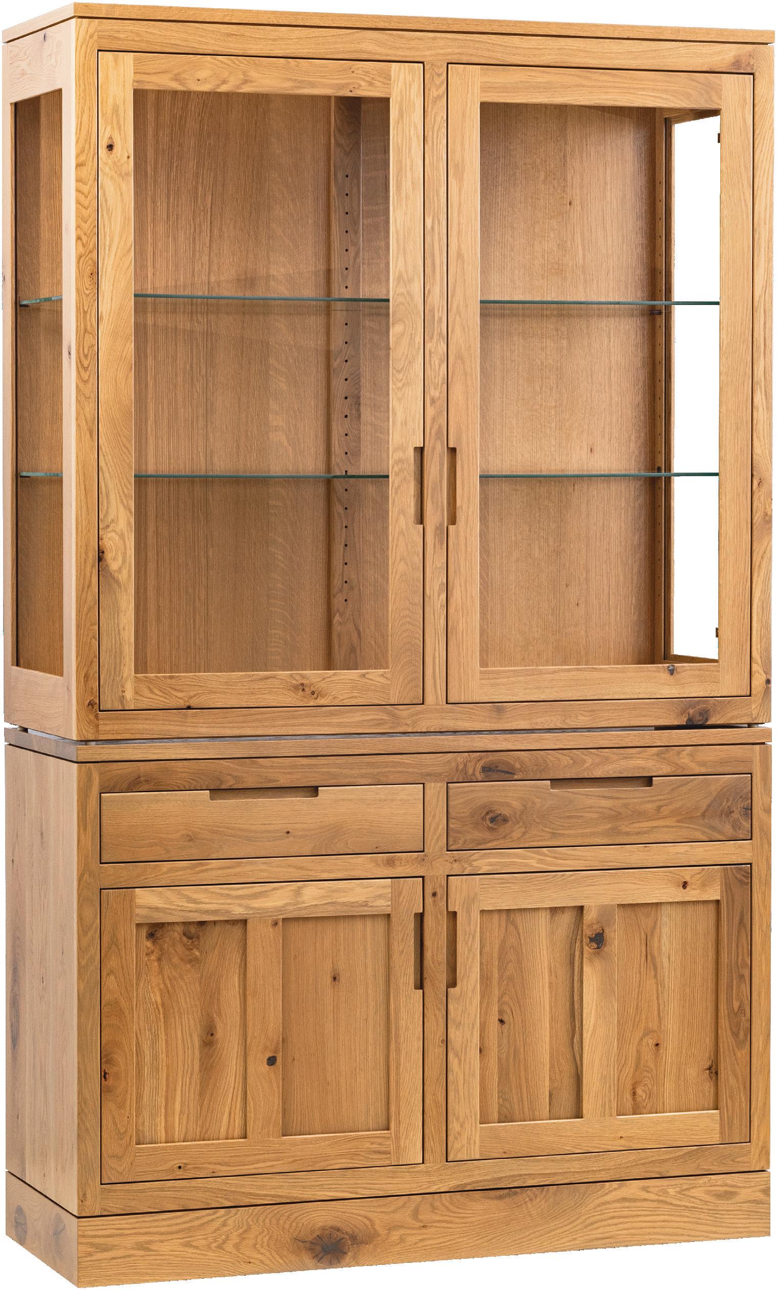 Far left and right doors have adjustable shelf 2 center doors share 1 long adjustable shelf European hinges