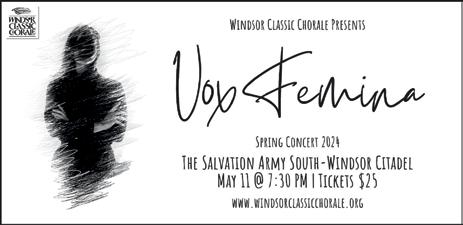 First up is the Windsor Classic Chorale presentation of Vox Femina, celebrating women in the choral arts on Saturday, May 11 at 7:30 p.m. at the Salvation Army South-Windsor Citadel.