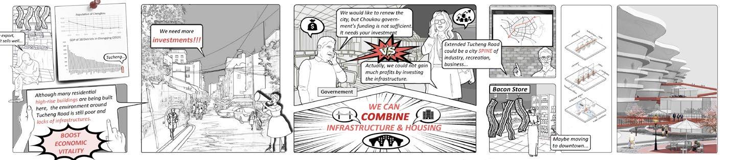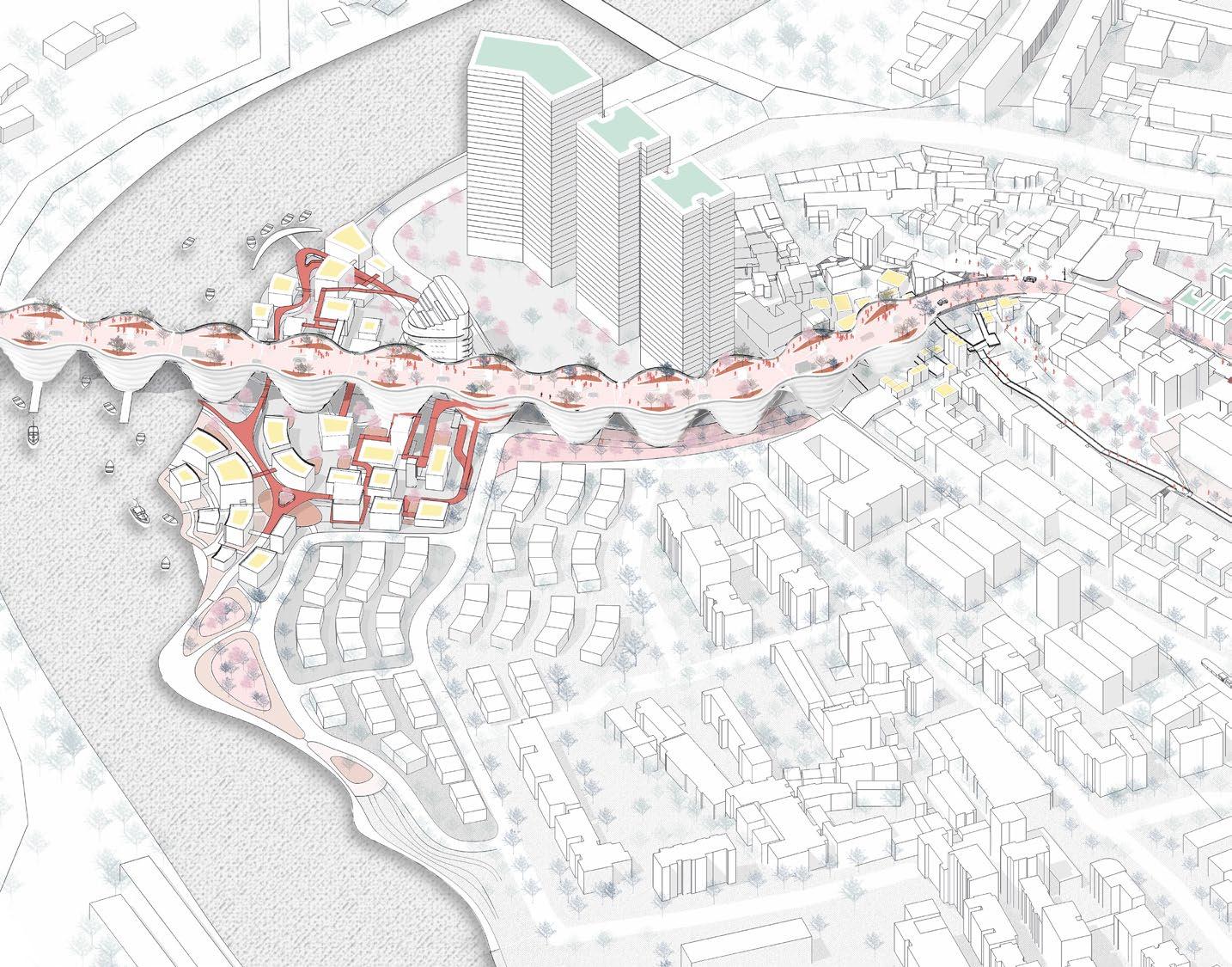 The warehouses are transformed to residential building, which provides housing for both workers and tourists. The reorganized train route goes over the factory for commuting and sightseeing.