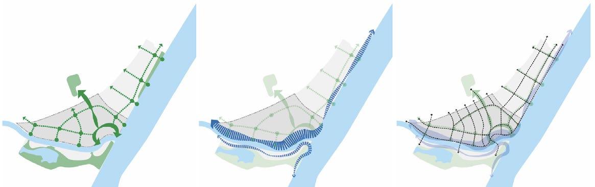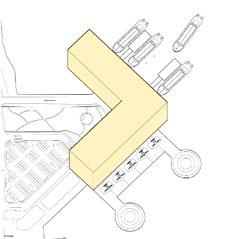 The "L" shape building is constituted of two volumes - vertiport and ferry building. These two main programs are connected by the central plaza, which is also the destination of green belt. The driveway goes around the inner coner of the "L" shape building to pick up and drop off passengers.