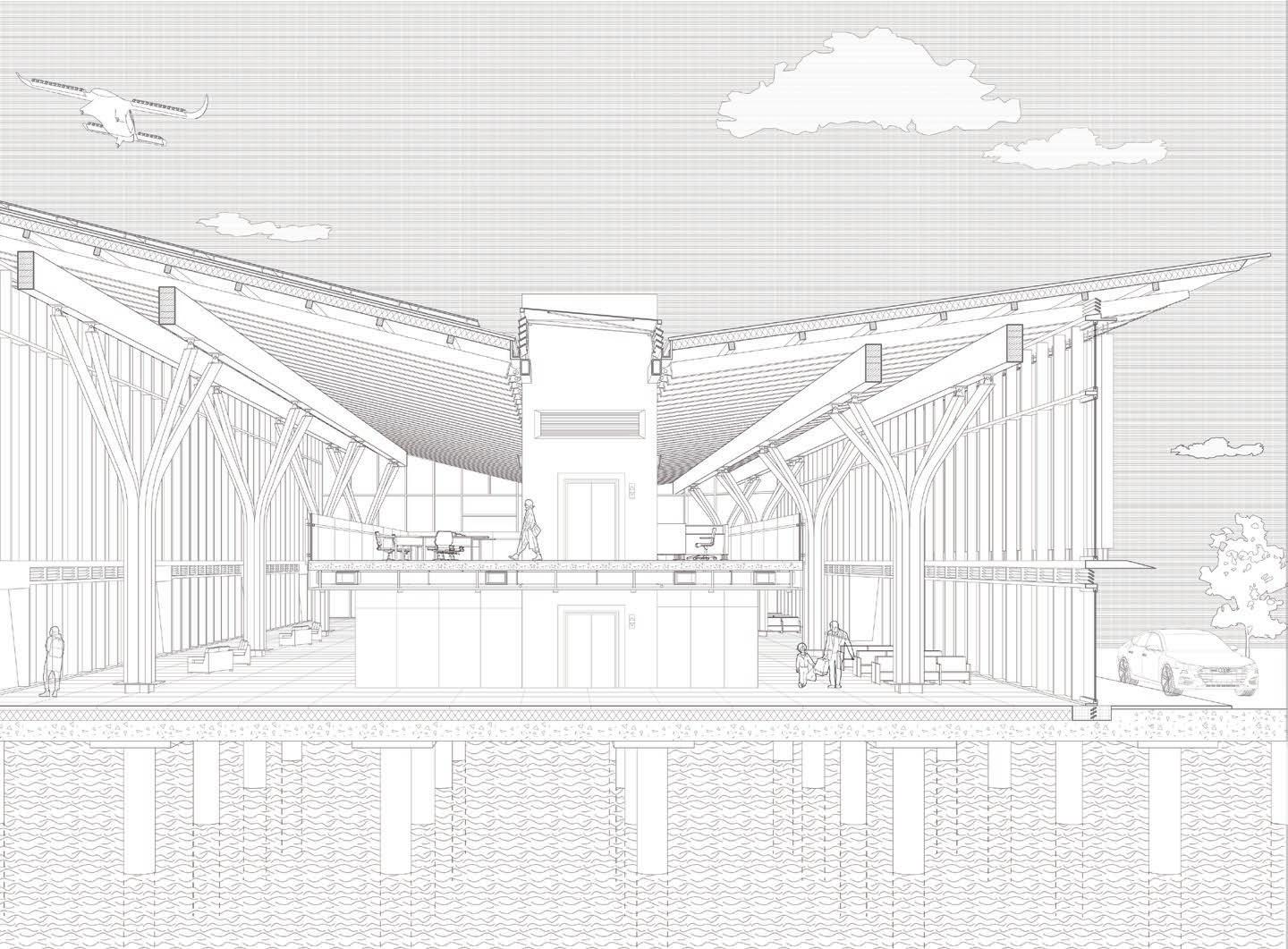 This project emphasizes the use of mass timber, blending sustainability with modern architecture. The project is built around three core principles: enhancing nature,creating a transportation hub, and activating a social hub. By utlizing natural materials like timber, the design harmonizes with the envronment, promoting a sense of ecological awareness. As a transportation hub, it integrates air and sea travel, providing seamless connecions for urban mobility. The space alo serves as avibrant social hub, with open public areas designed to foster community interaction and leisure. The combination of nature, fransporation, and social engagement fransforms the veriport into a multifunctional urban landmark, redefining the future of travel and public space in Mision Bay.