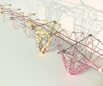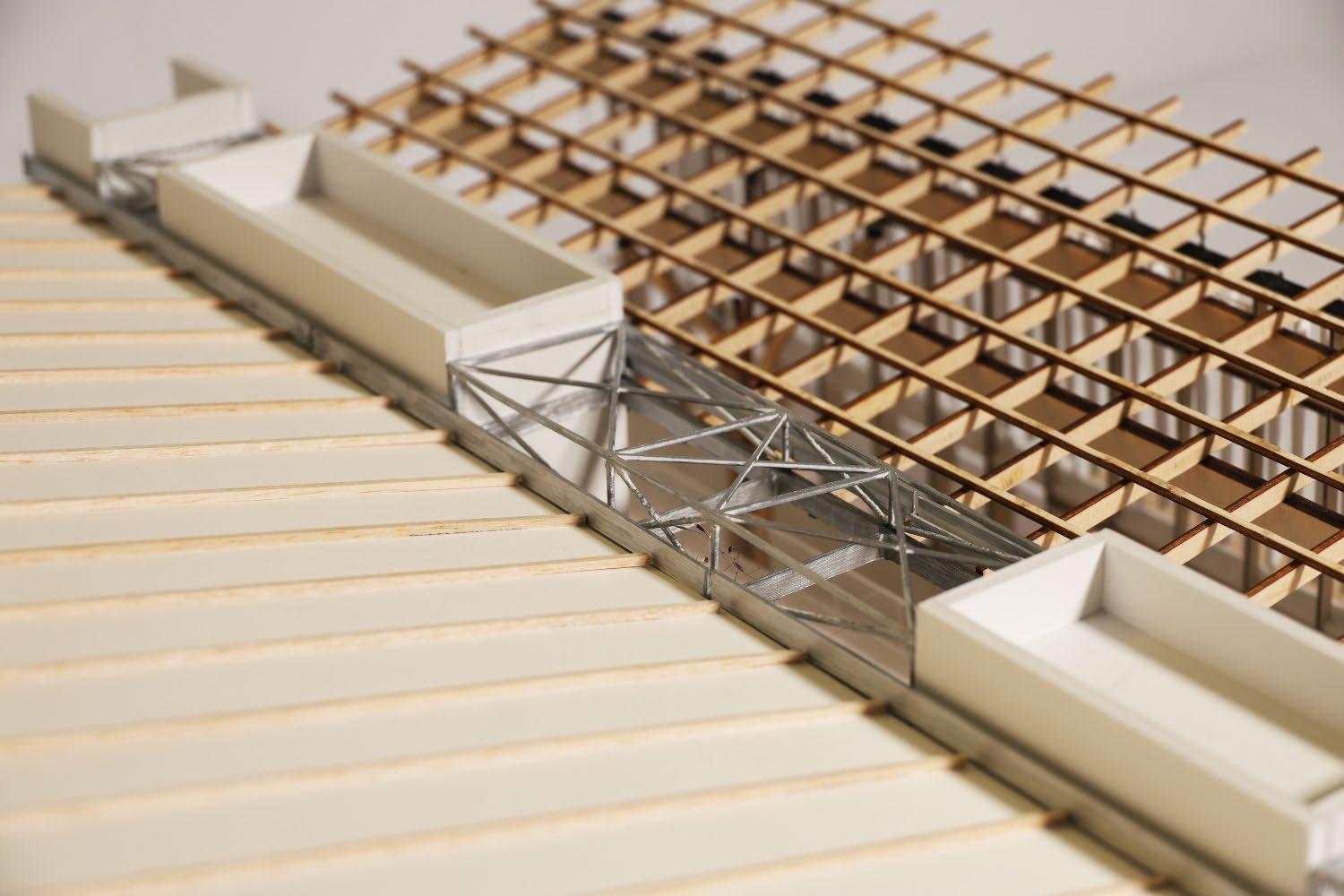 The physical model demonstrates how four branching tree-like columns support the primary beams. A steel plate at the base reinforces the four column segments, ensuring stability. Steel nodes at the ends of the branches create strong connections between the columns and the beams.