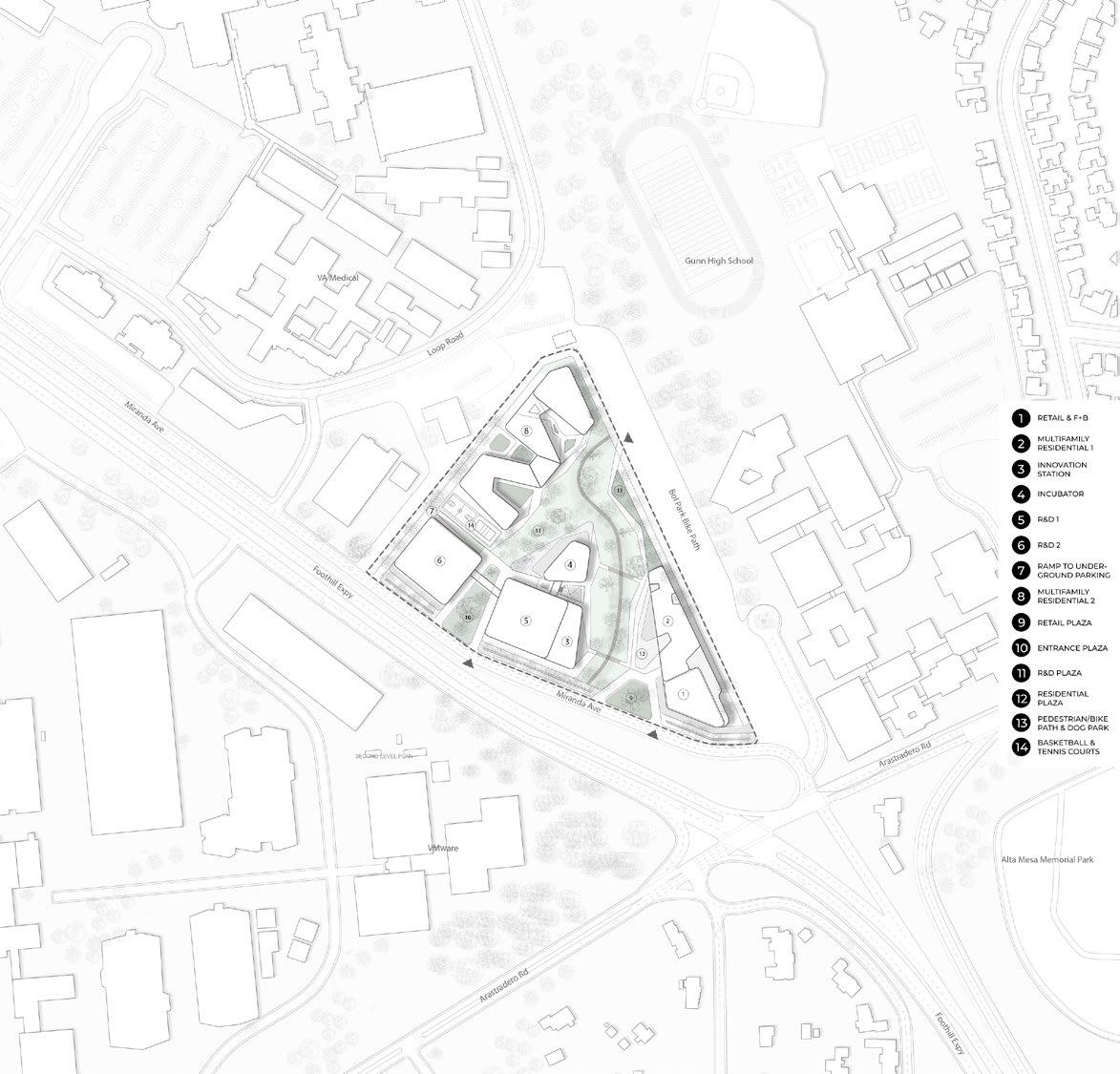 Our vision was to position the Discovery District as a catalyst for reimagining the neighborhood, shifting public perception through intentional placemaking. The design aims to be both legible and purposeful, reinforcing the district’s identity as an appealing place to live and work. The mixed-use development includes two R&D buildings, an incubator, an innovation center, and two multi-family residential buildings. A thoughtfully designed landscape ties the area together, serving both Gunn High School students and local professionals.