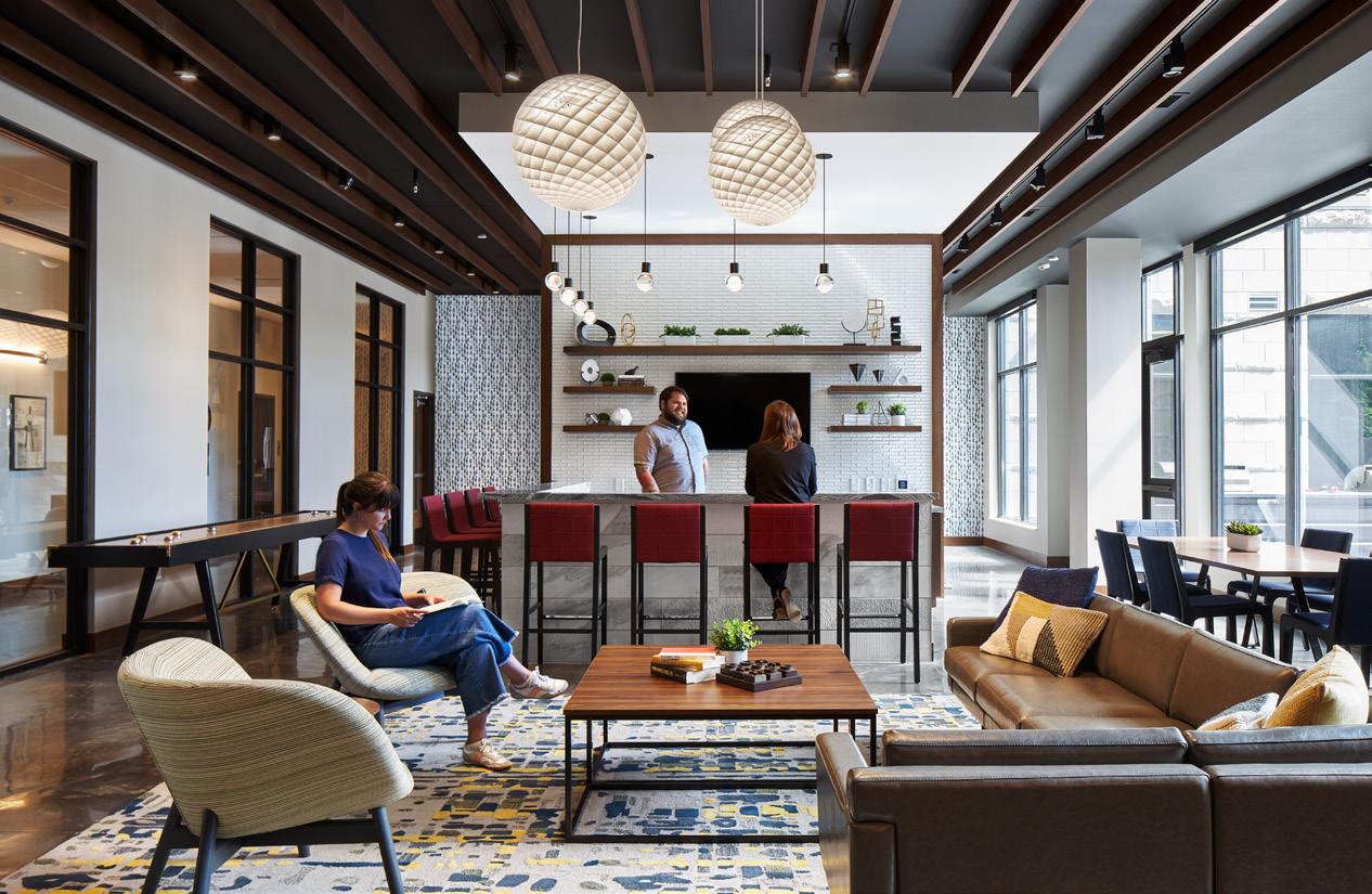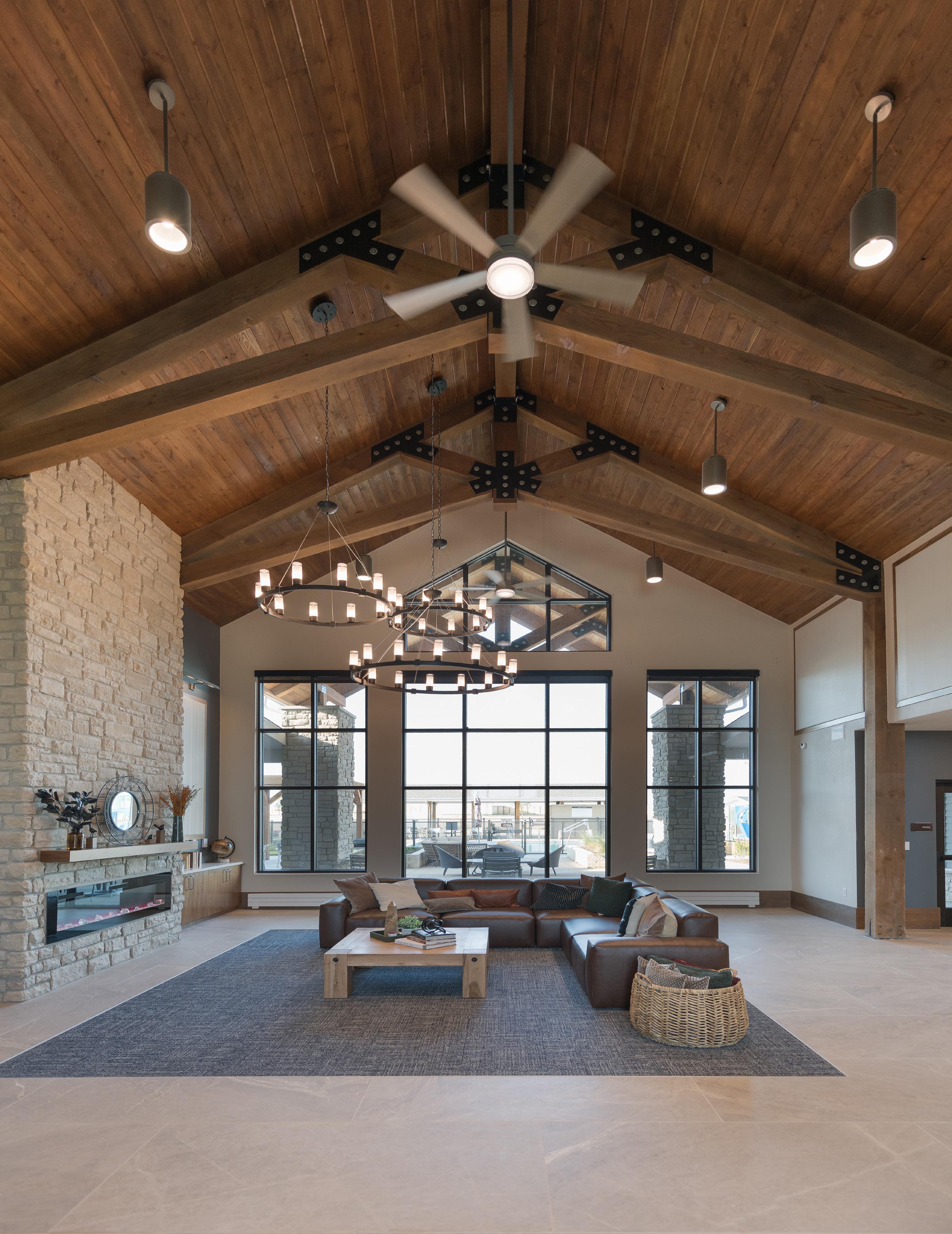 Interior design concepts are focused on: fresh, family, comfort and community, which can be seen throughout. Upon entering the building, a large lobby welcomes residents and guests with contrasting finishes and textures. There is a balance of wood on the floors and ceilings which carrys into the clubroom bringing warmth to the spaces. Multiple seating arrangements in the clubroom provide opportunities for gatherings, both large and small. A grand 2-story fireplace creates a focal feature in the space. A kitchenette flanked by built-in booths provides a cozy nook for residents to work or converse. A bright and fun indoor kids’ room with play structure, books, and interactive gaming system provides a space for even the littlest resident. The fitness center overlooks the play space allowing parents to watch their children as they work out. Wayfinding is found on corridor floors with color blocking and art playing off the history of the site, demographics, and interior design.
