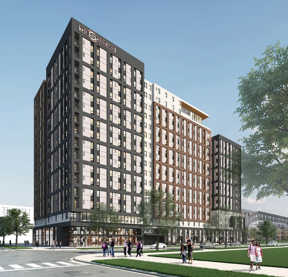 The Standard is a 17-story student living community BKV Group is developing with Landmark Properties (with this project being Landmark’s first in Minnesota). Located at the corner of 15th and 6th on a site that is today made up of 10 parcels of land, The Standard will include 323 residential units and 211 indoor parking spaces, with the amenities on the ground floor including a lobby, leasing office, and a bike lounge. More amenity spaces will be located on level three which will feature an indoor lounge space and two outdoor courtyards, plus – on the top floor – there will be a large indoor amenity space, an outdoor rooftop space, and a large rooftop amenity deck complete with a pool and hot tub.