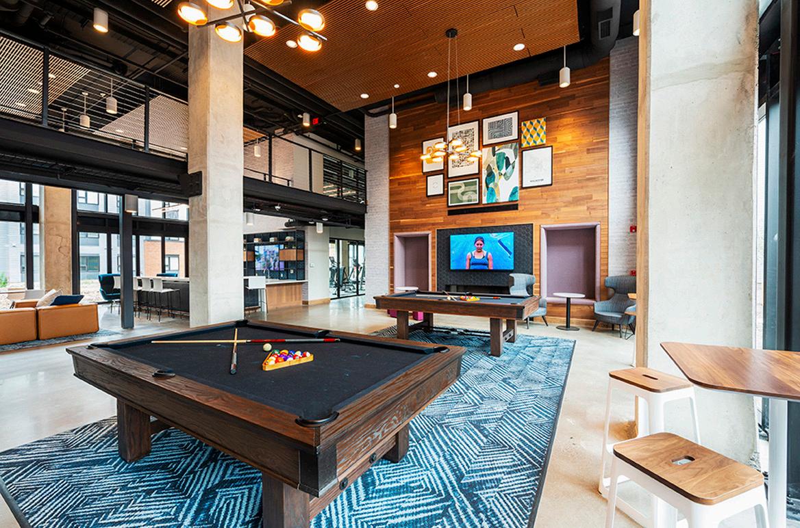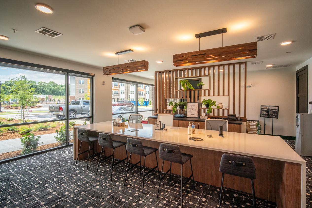 Signature Hartwell Village is an upscale student housing development near the Clemson University campus in South Carolina. This newly constructed off-campus community draws inspiration from the scenery of South Carolina, and nods to the history of the university’s campus. Soft, natural colors combined with wood accents and vining greenery allow residents to feel immersed in the natural beauty of South Carolina, while a campus connection comes through brick textures and quirky art and accessories featuring the university’s mascot: the tiger. Systems of black metal framework help to create zones within the amenity space while bringing a youthful urban edge to the design. These elements combine to create a mature, inviting, and fun space conducive to both studying and socializing.
