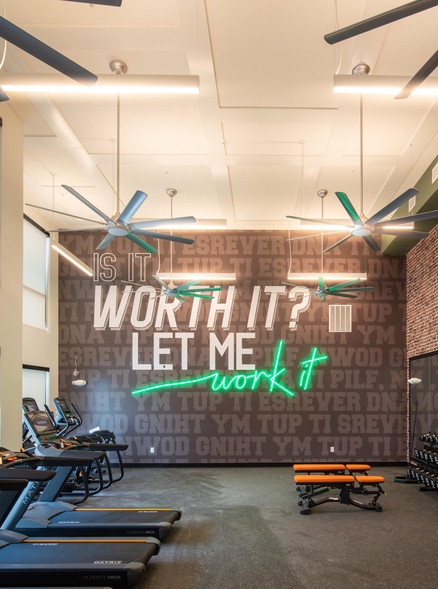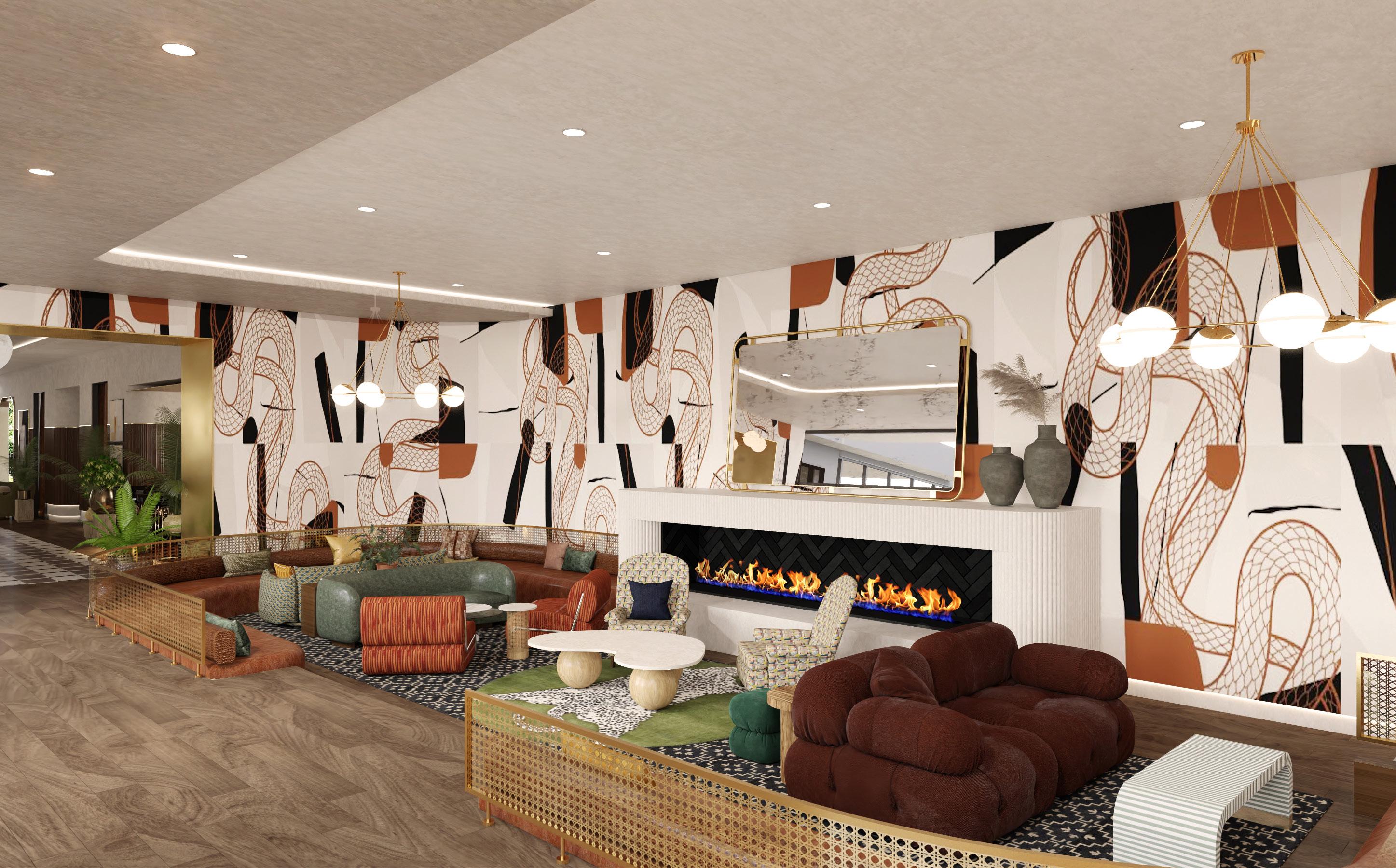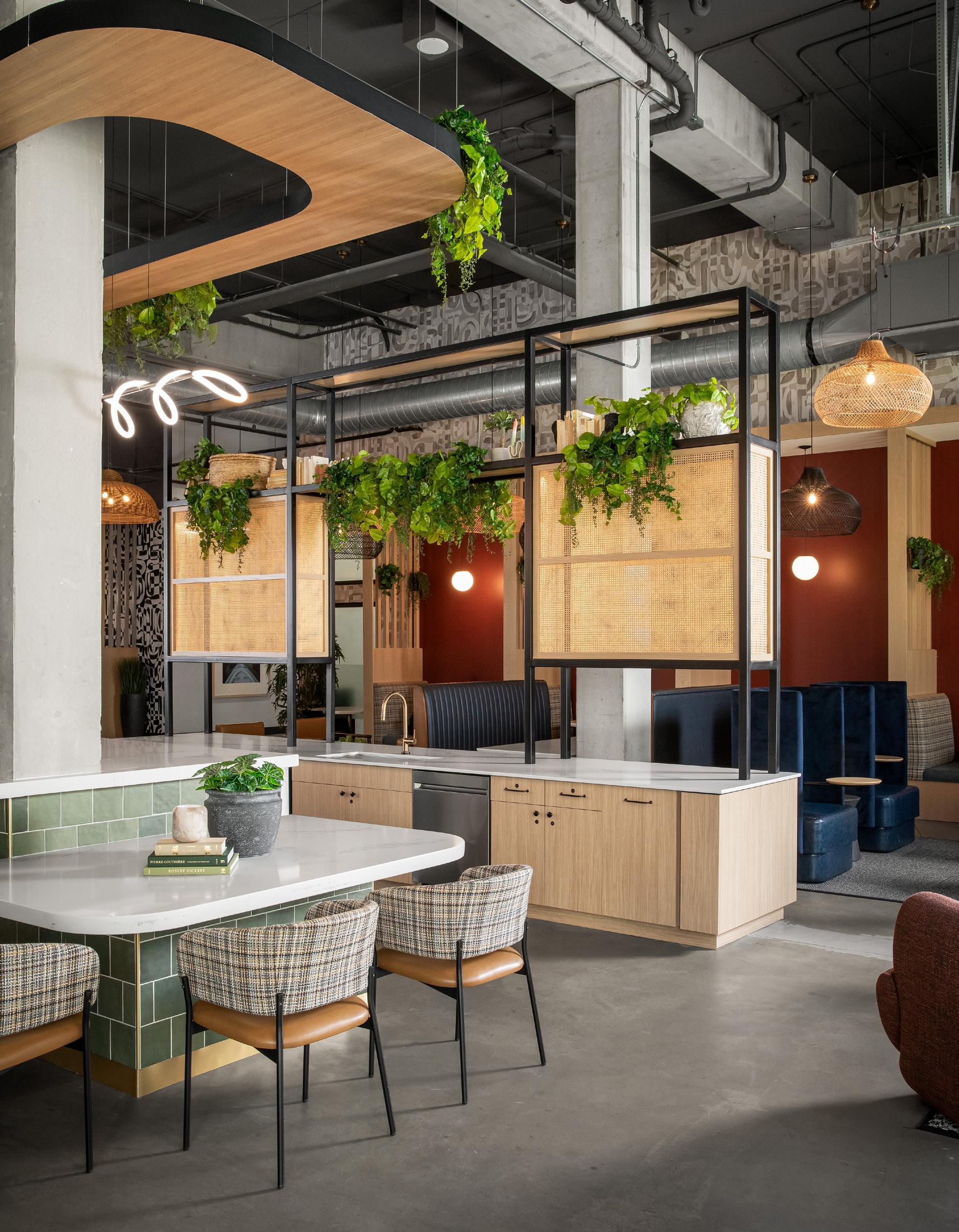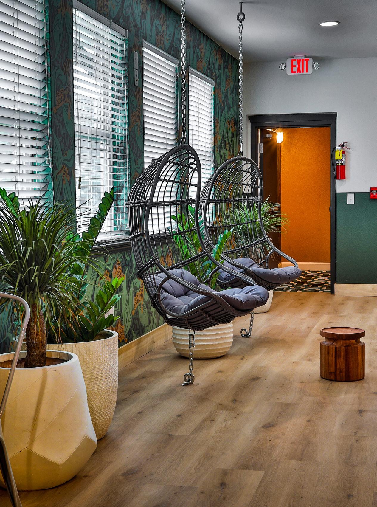 Students at Georgia Southern University reside in colorful cottages that dot this vibrant housing development. The existing clubhouse, however, was drab, dated, and in need of added vitality. The first impression starts here, and our design team went wild with this renovation; taking inspiration from Southern’s grand live oaks, lush lawns, and colorful botanical gardens. Residents enter through a colorful portal, greenery climbs the walls and dangles from above and natural woven lighting is strung from the ceiling, swinging near the windows. The two-story lobby connector space is where all programs converge; a central watering hole for residents with the leasing office and café accessed through open garage doors allowing the spaces to flow into one another. A fitness space (cardio, weight room, and yoga), study lounge, and game room round out the space types, and the punchy patterns, leafy motifs, and animal prints create an energizing quality to this clubhouse kingdom.