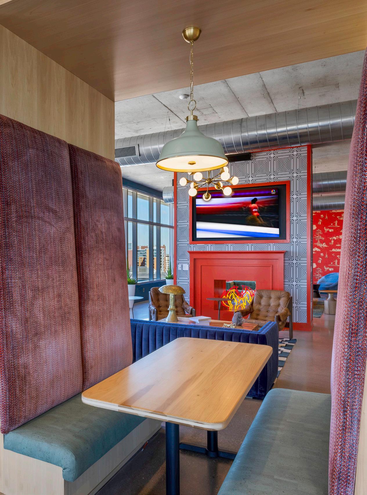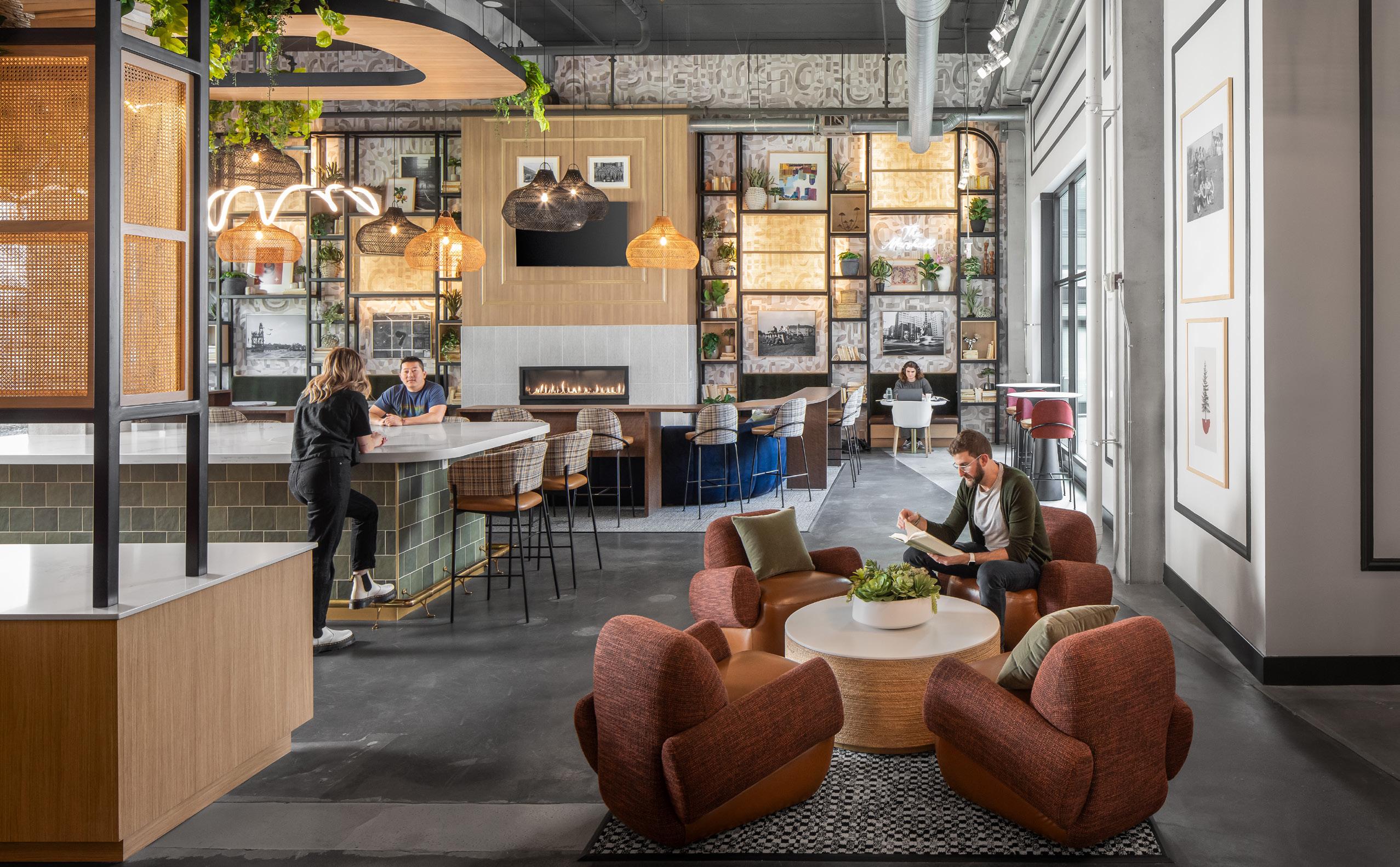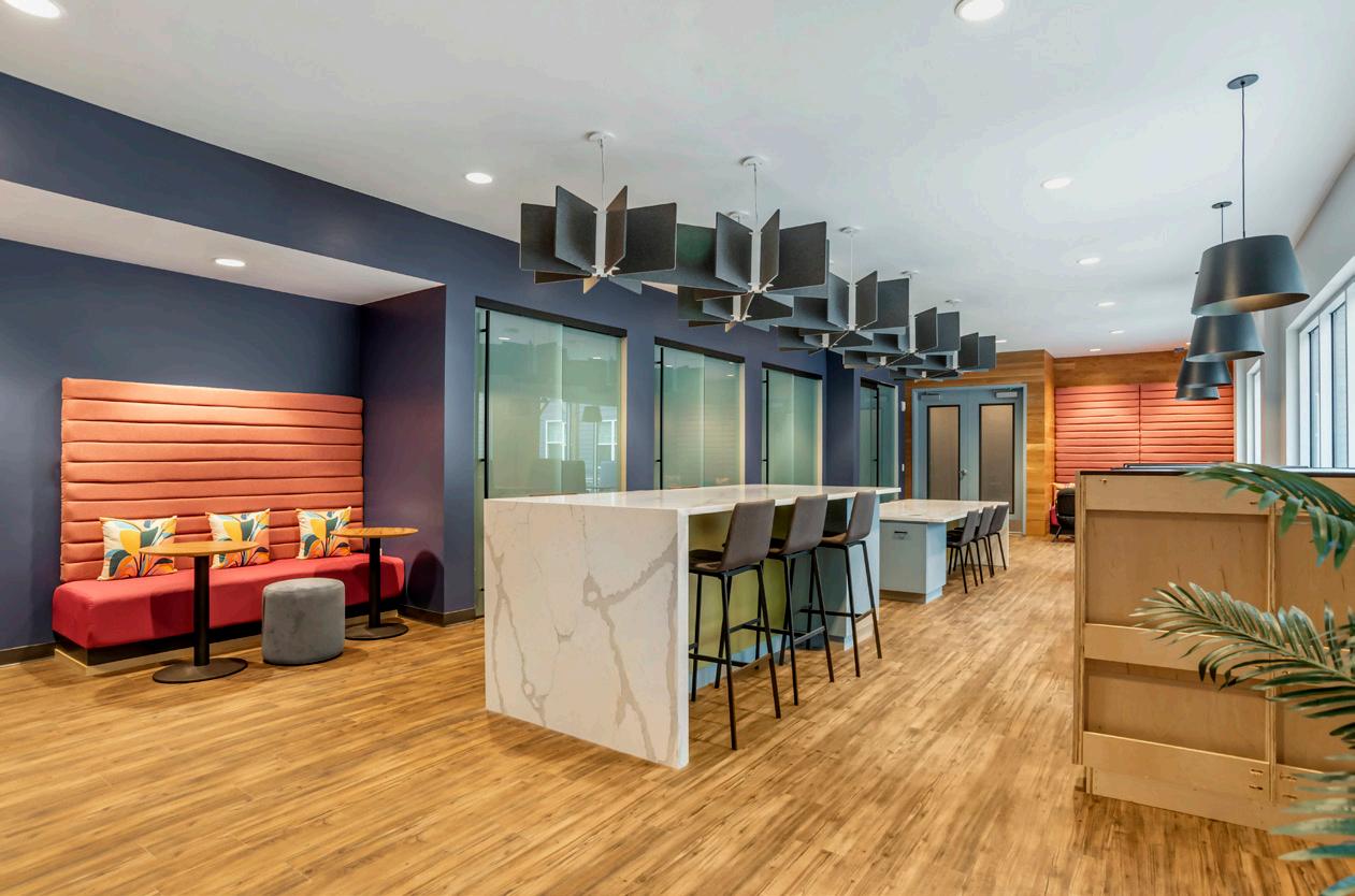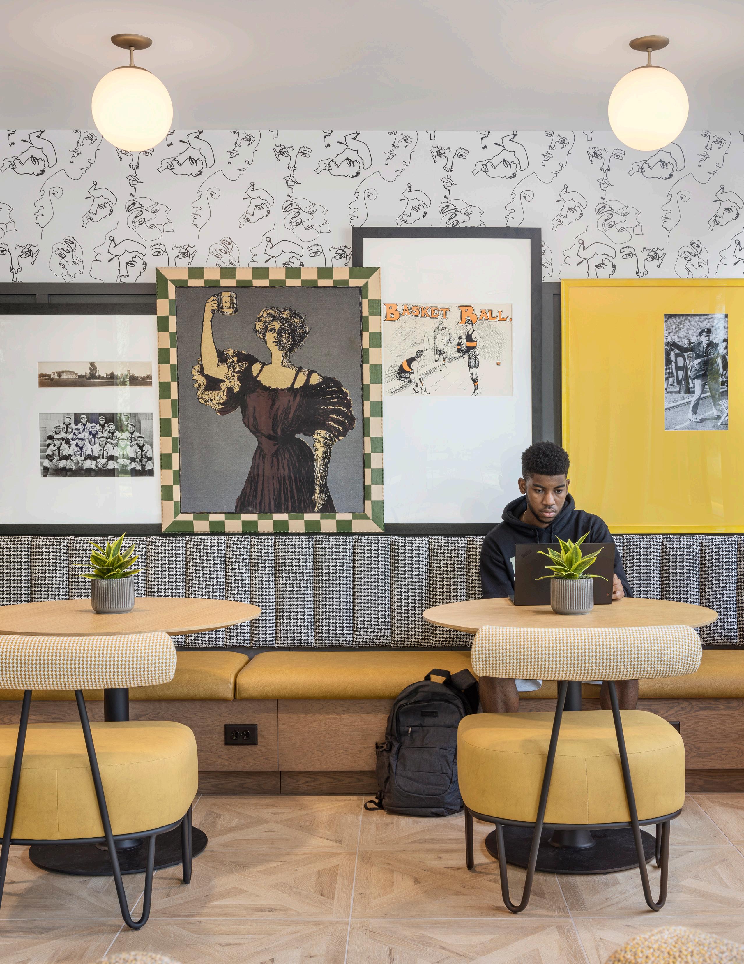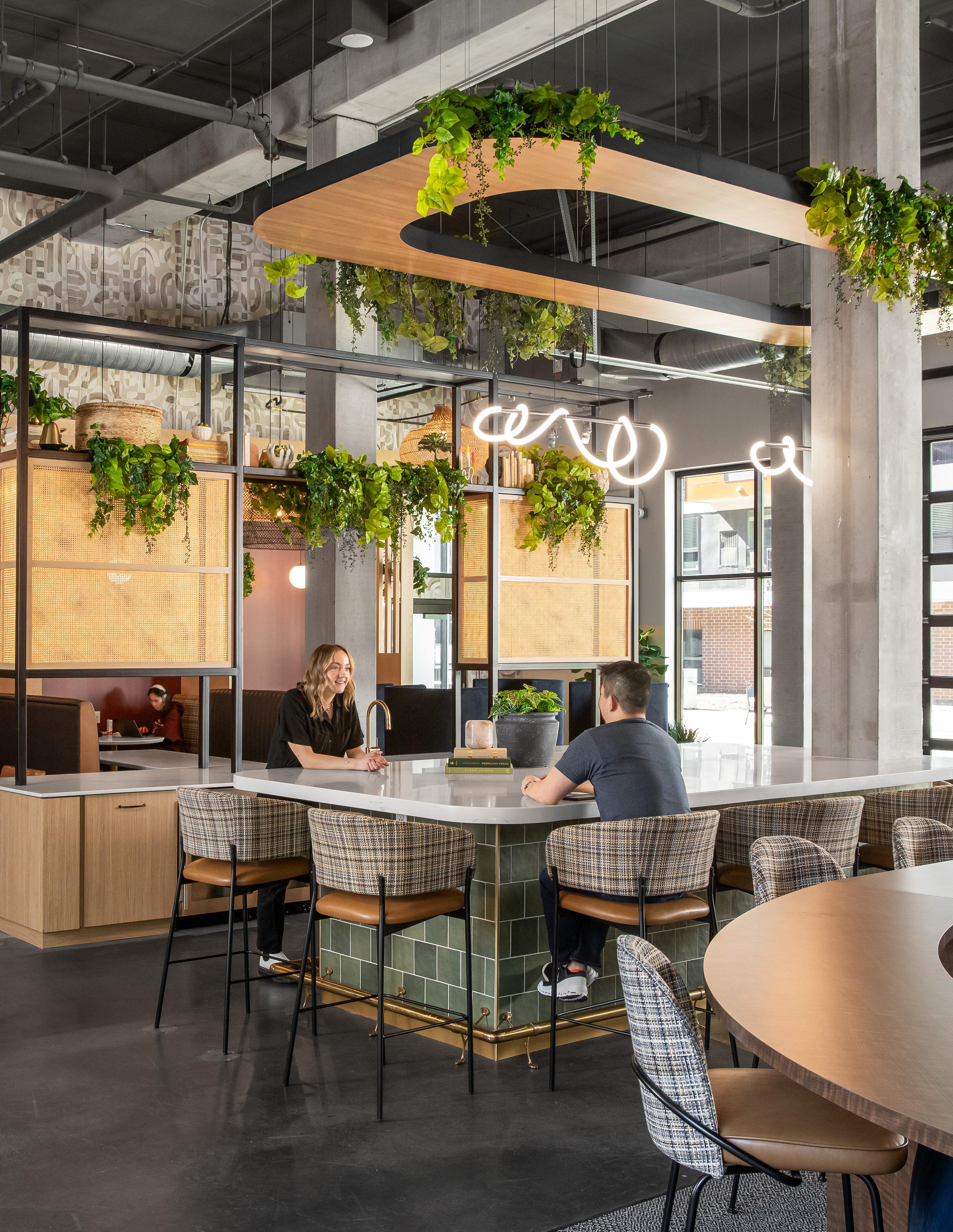 Students at Georgia Southern University reside in colorful cottages that dot this vibrant housing development. The existing clubhouse, however, was drab, dated, and in need of added vitality. The first impression starts here, and our design team went wild with this renovation; taking inspiration from Southern’s grand live oaks, lush lawns, and colorful botanical gardens. Residents enter through a colorful portal, greenery climbs the walls and dangles from above and natural woven lighting is strung from the ceiling, swinging near the windows. The two-story lobby connector space is where all programs converge; a central watering hole for residents with the leasing office and café accessed through open garage doors allowing the spaces to flow into one another. A fitness space (cardio, weight room, and yoga), study lounge, and game room round out the space types, and the punchy patterns, leafy motifs, and animal prints create an energizing quality to this clubhouse kingdom.