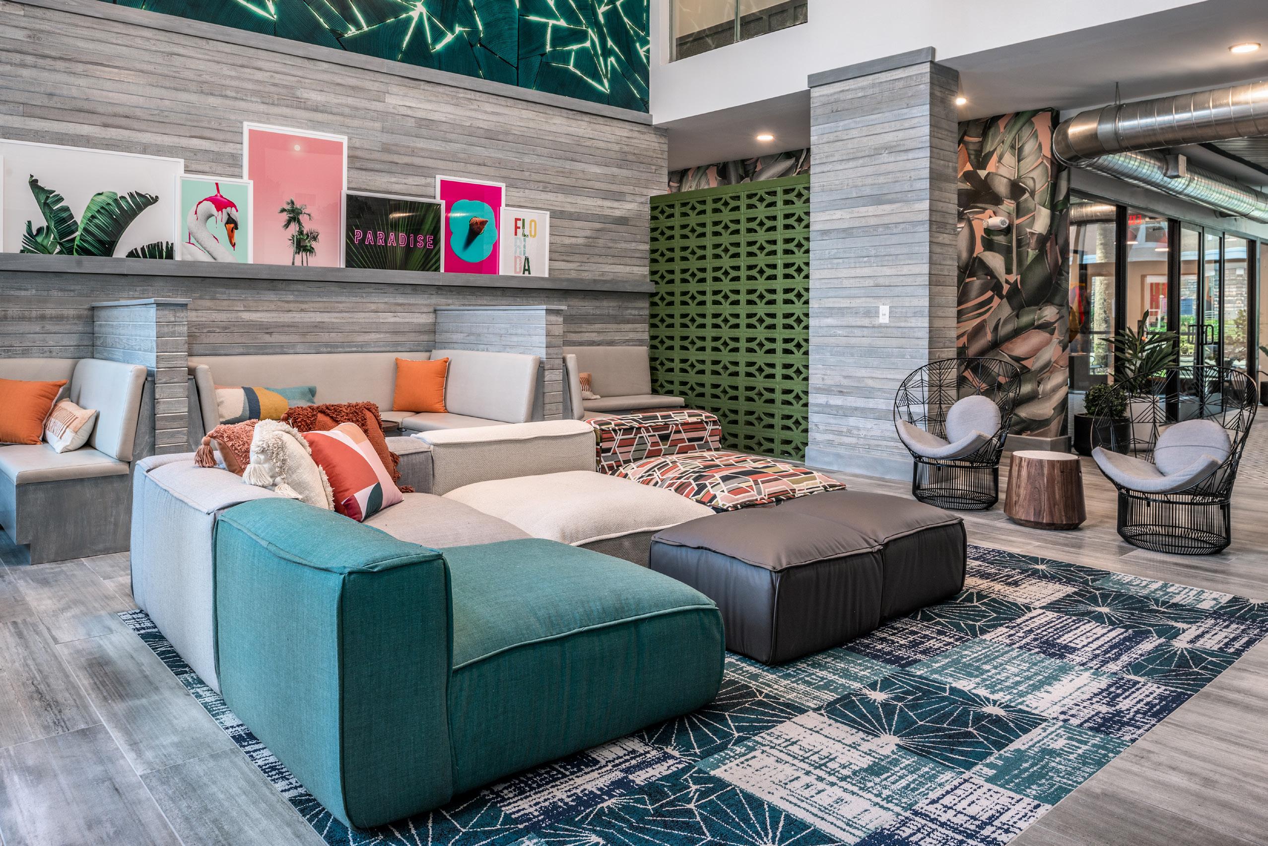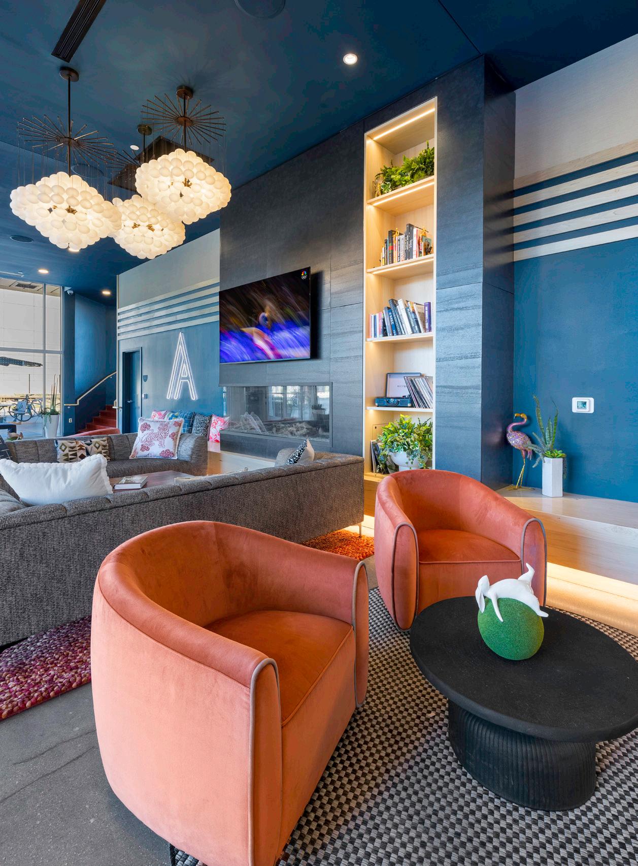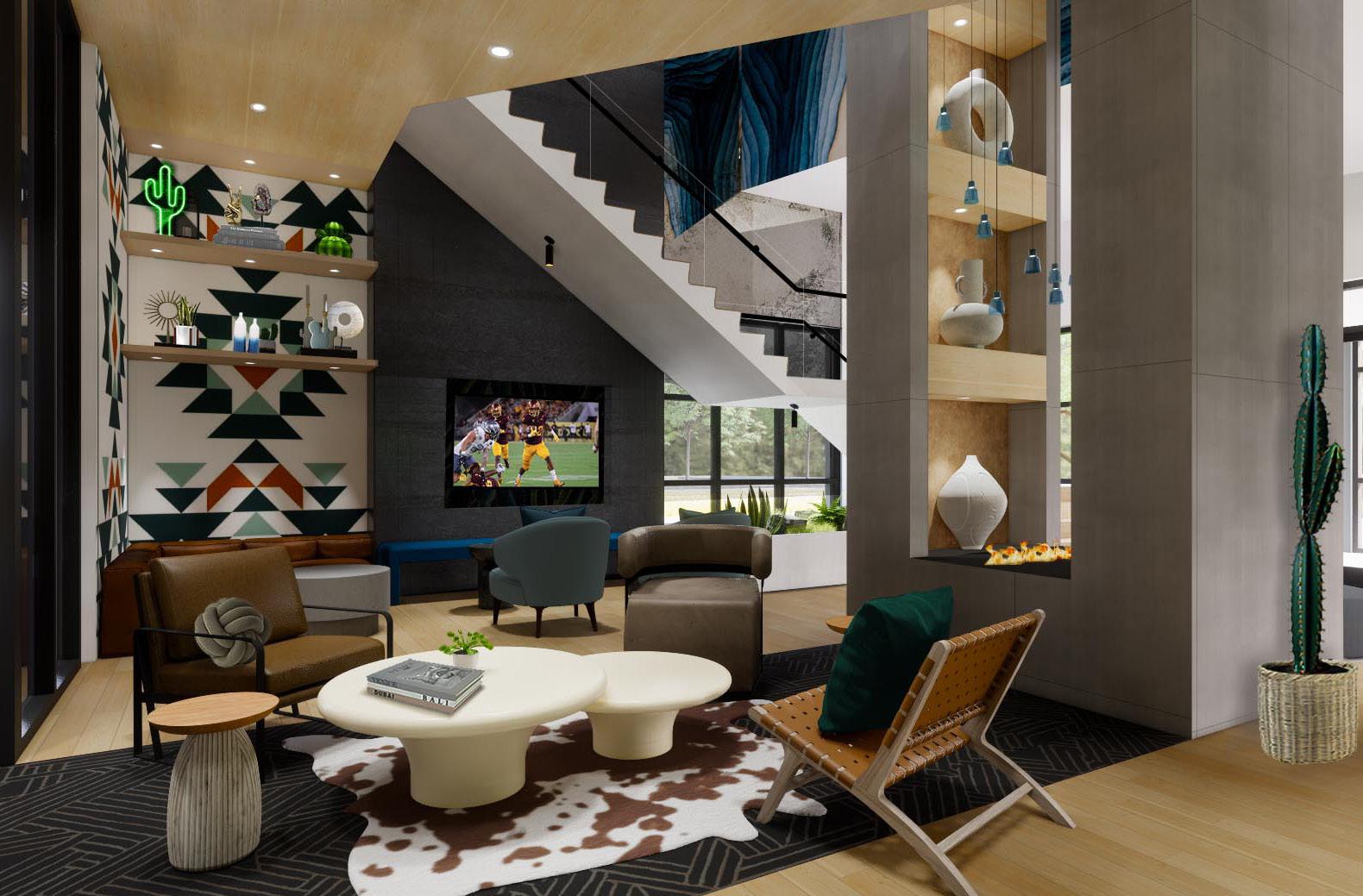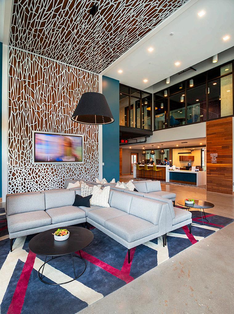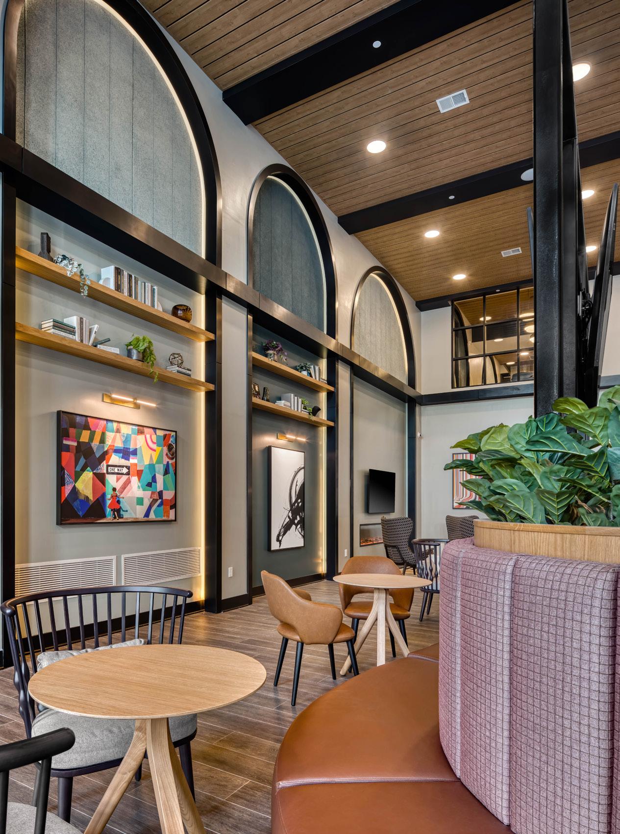 The interior design of Aves showcases a mix of grey washed and natural wood tones balanced with vibrant colors and patterns giving residents the look and feel of resort-style living. Residents have the ability to utilize the clubhouse for social gatherings as well as group study activities all while being steps away from the lush courtyards and the pool deck.