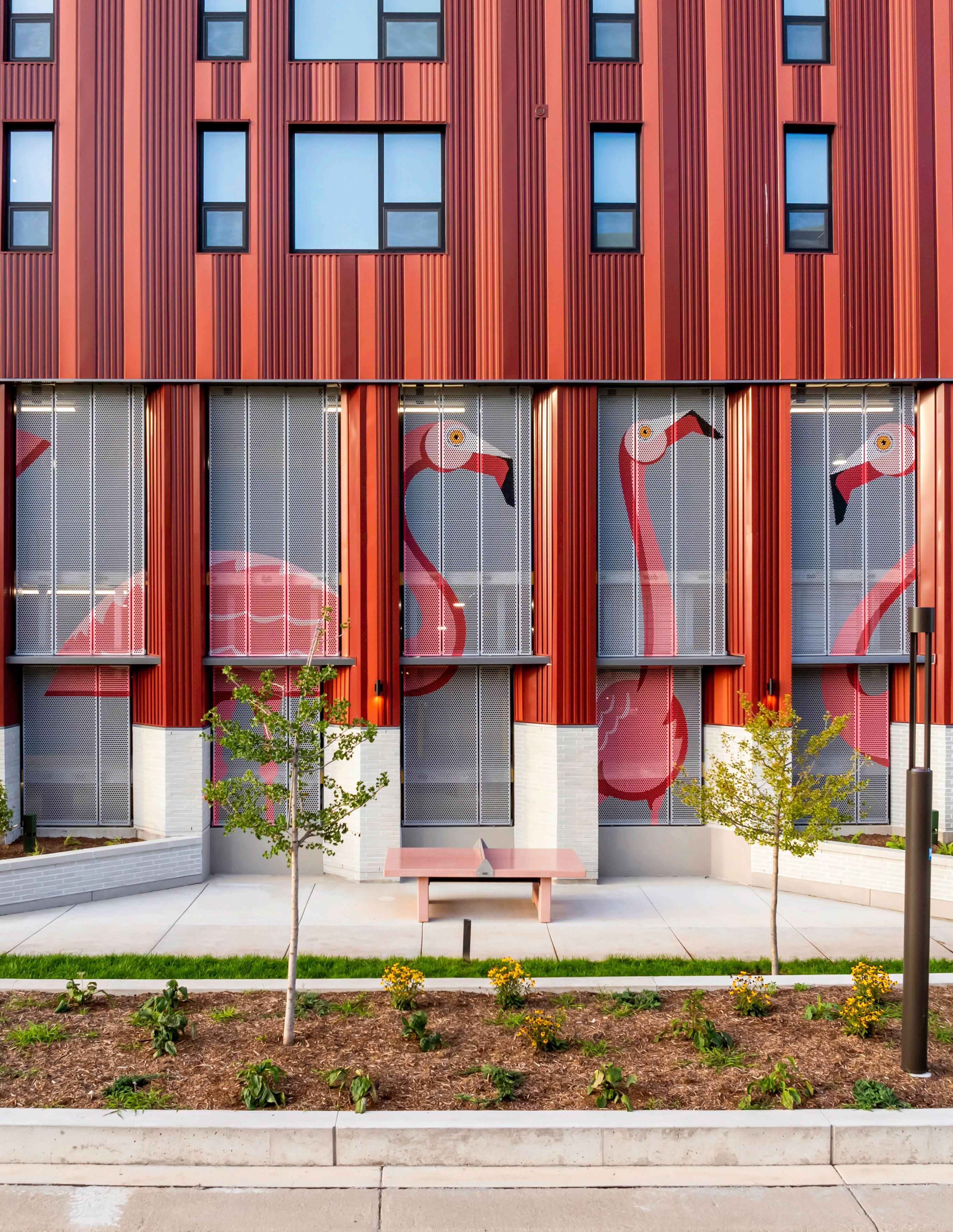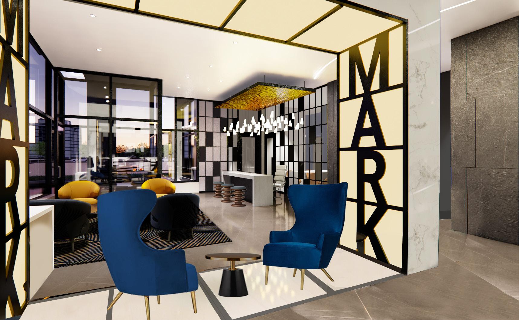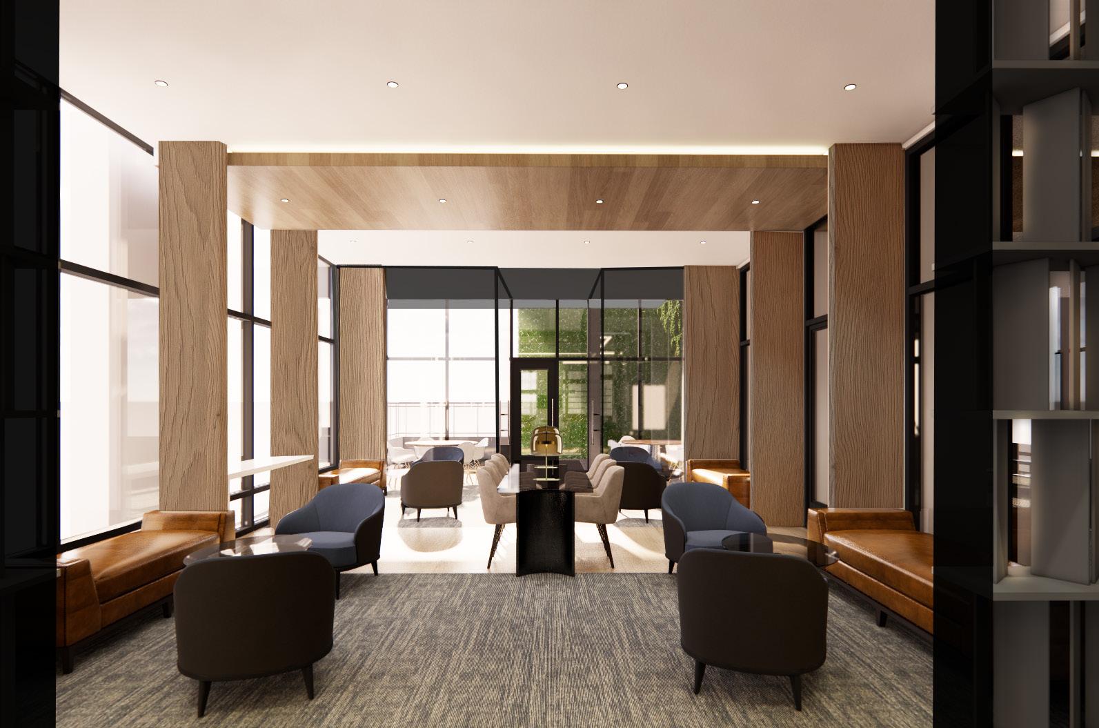 The design of the building will create an urban corner with groundlevel leasing and amenity spaces facing the north and northeast corner. Also, along the north side adjoining property line, there will be a coffee lounge with additional amenity spaces, and the exterior structure consisting of terracotta, porcelain tile, metal panels, and glass. The form of the building relates to the height and scale of the surrounding context and the configuration of the building allows for expressions of horizontally and vertically designed building footprint, capped by an amenity deck on the seventh level to take advantage of views to the city.