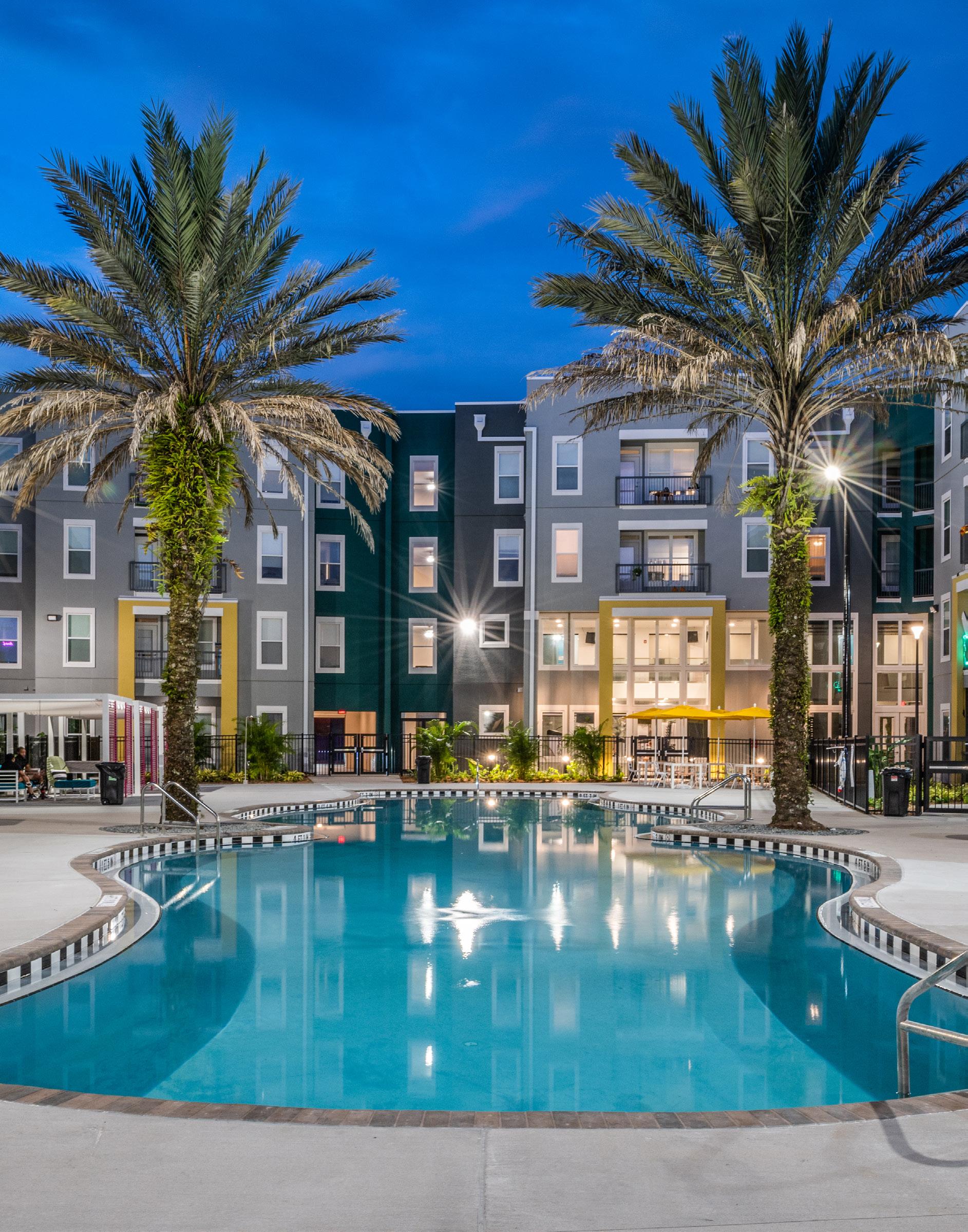Students can relax and recharge with resort-style amenities while enjoying Florida’s sunny weather at one of four pools on property, in addition to a fitness center, yoga studio, ping pong table, cozy fire pits, and endless lounge areas to gather and socialize.