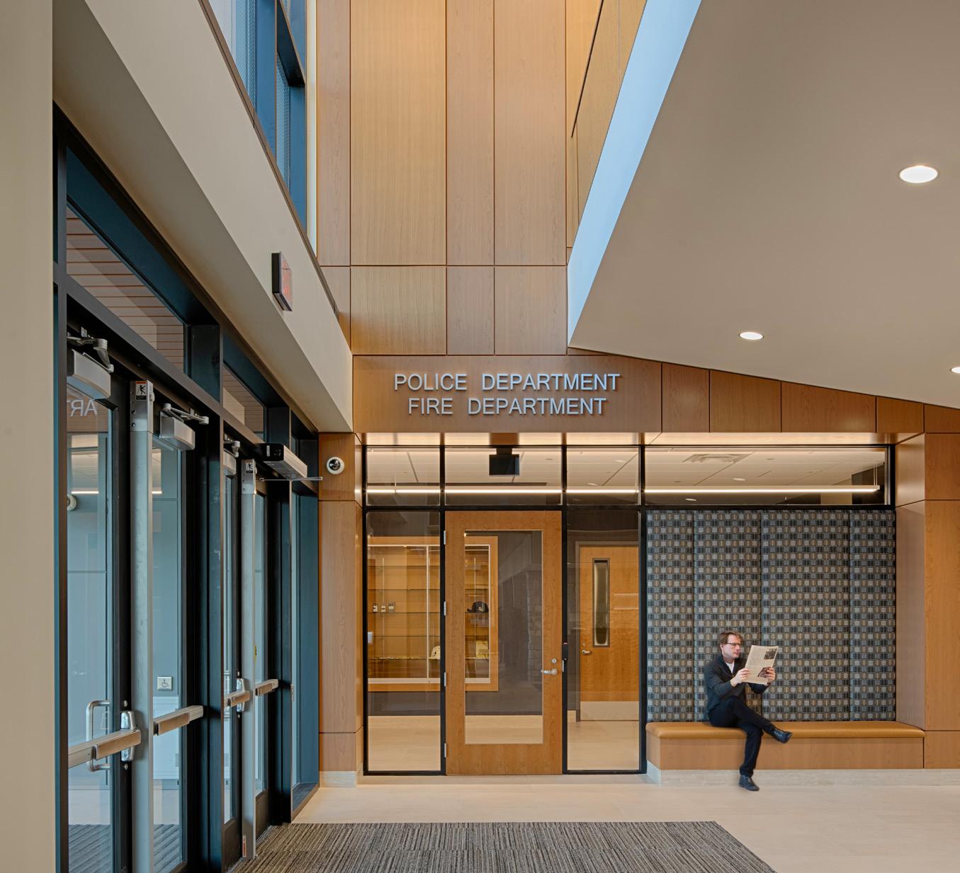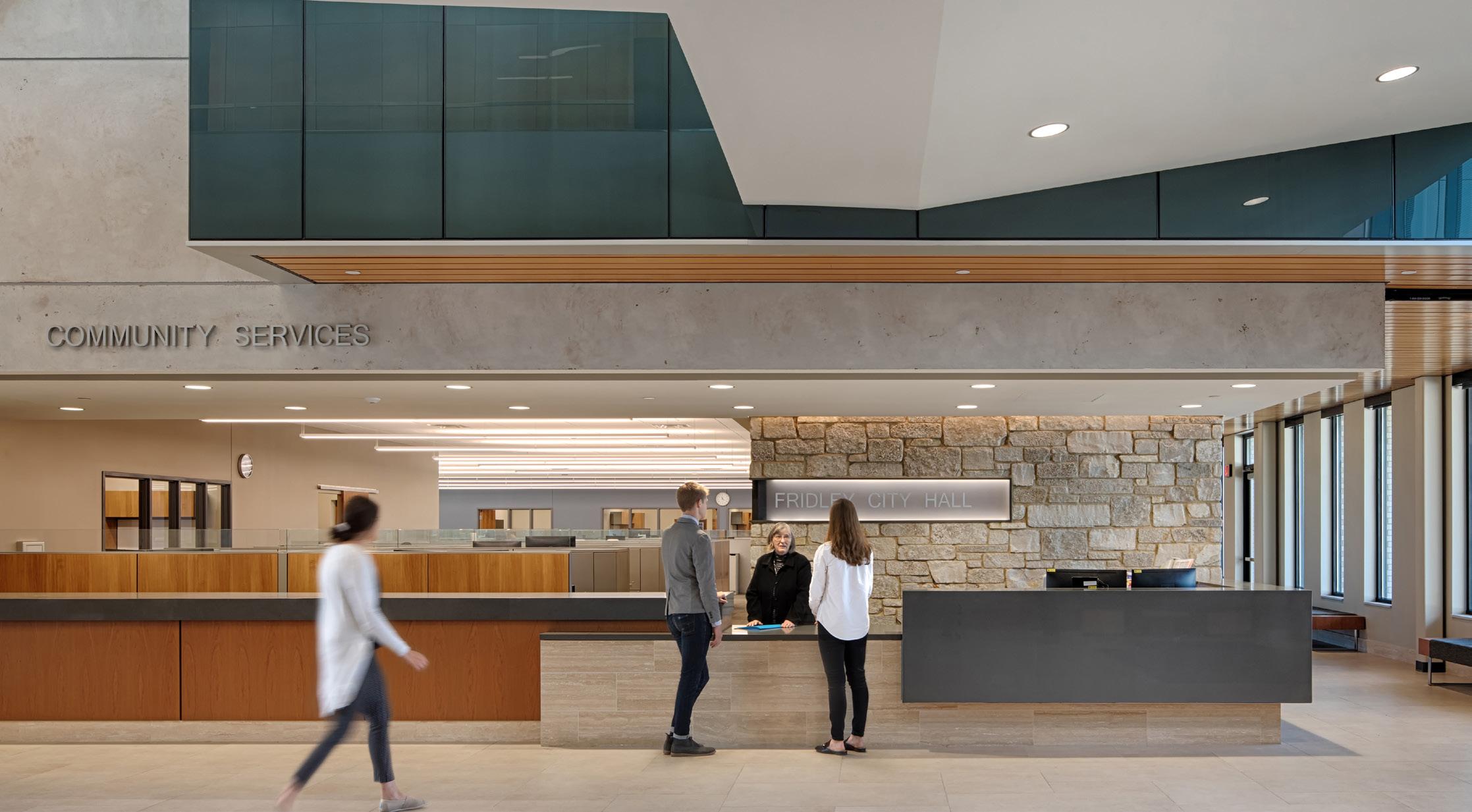 Merging multiple programs together into one, connected building, Fridley Civic Campus is a municipal improvement project featuring a new City Hall, Public Safety facility, and Public Works facility, organized around a central water feature and shared plaza. The City Hall includes administrative offices, public service counters with adjacent breakout conference rooms, community-use space, and a showpiece council chambers. All staff spaces are located on the first floor to improve collaboration, with the police and fire facilities located across the lobby from the City Hall which also houses a public lobby, records storage, police administration, investigations, and patrol spaces. The second floor provides an EOC, training rooms, a fitness room, and public office spaces and council chambers. The lower level of the Fridley Civic Complex contains a squad garage, a small holding facility with attached vehicle sallyport, evidence processing and storage area, and a five-lane firing range.