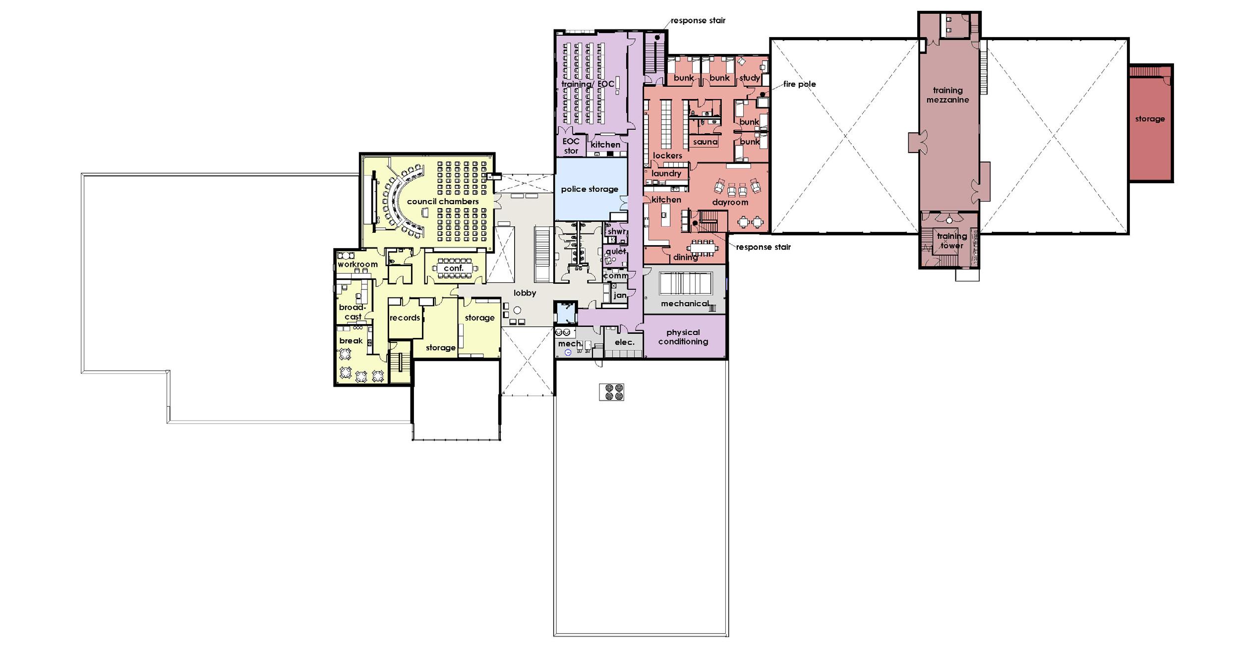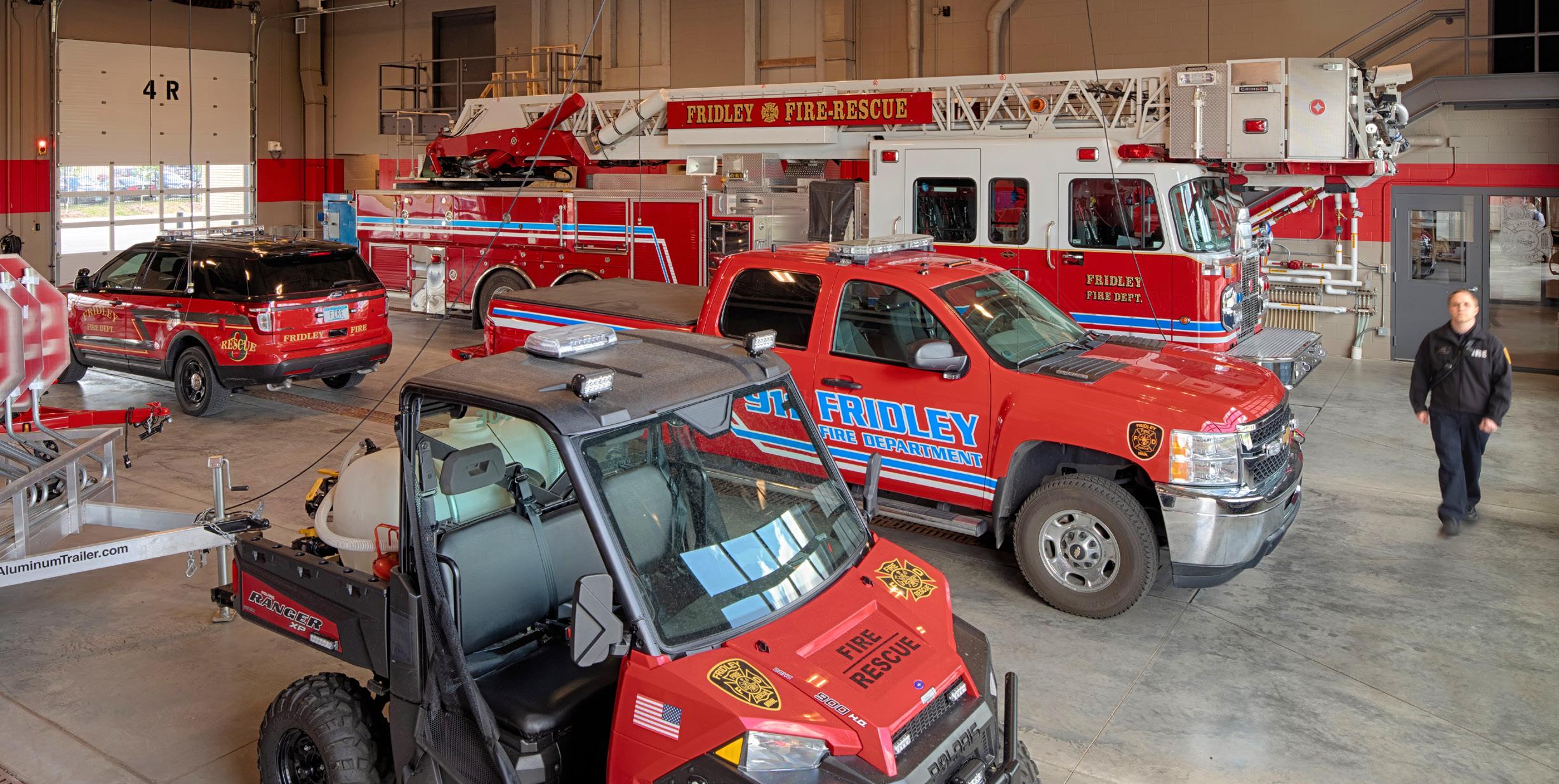 The Fridley Civic Complex will include a new City Hall with administrative office and associated areas, Police Station, Fire Station, and a new Public Works Facility, with parking to accommodate staff and public. The fire station has administrative offices on the first floor and bunk rooms, a kitchen, and a dayroom for duty crews on the second floor. A fire pole provides direct access to the apparatus bays. The station is planned for up-to-date decontamination procedures, including a sauna to help clear skin of absorbed toxins. There are dual three-bay drive-through apparatus rooms. In between these is the watch room, maintenance shop, decontamination, the SCBA compressor, and turnout gear storage. Above the support functions is a large room for mazes and props to provide on-site training opportunities. Openings between this mezzanine space and the apparatus bays on either side provide support for laddering and bailout training. A training tower contains a training standpipe, stairs for hose advancement evolutions, manholes for confined space extrication practice, and rappelling anchors both inside and outside. These spaces are supported by a large training room shared with the Police Department and an area for vehicle fire training adjacent to the rear apron.