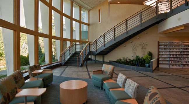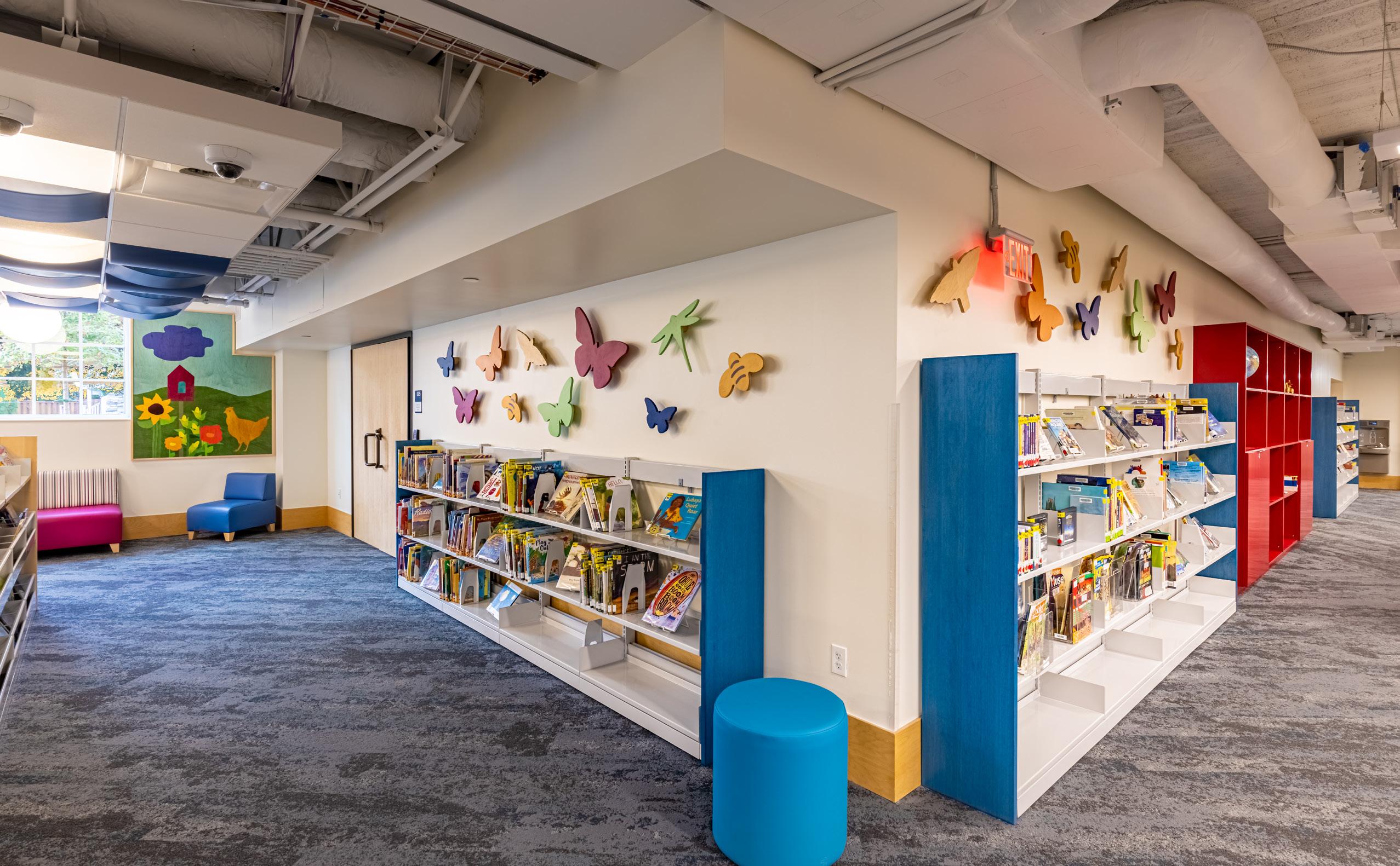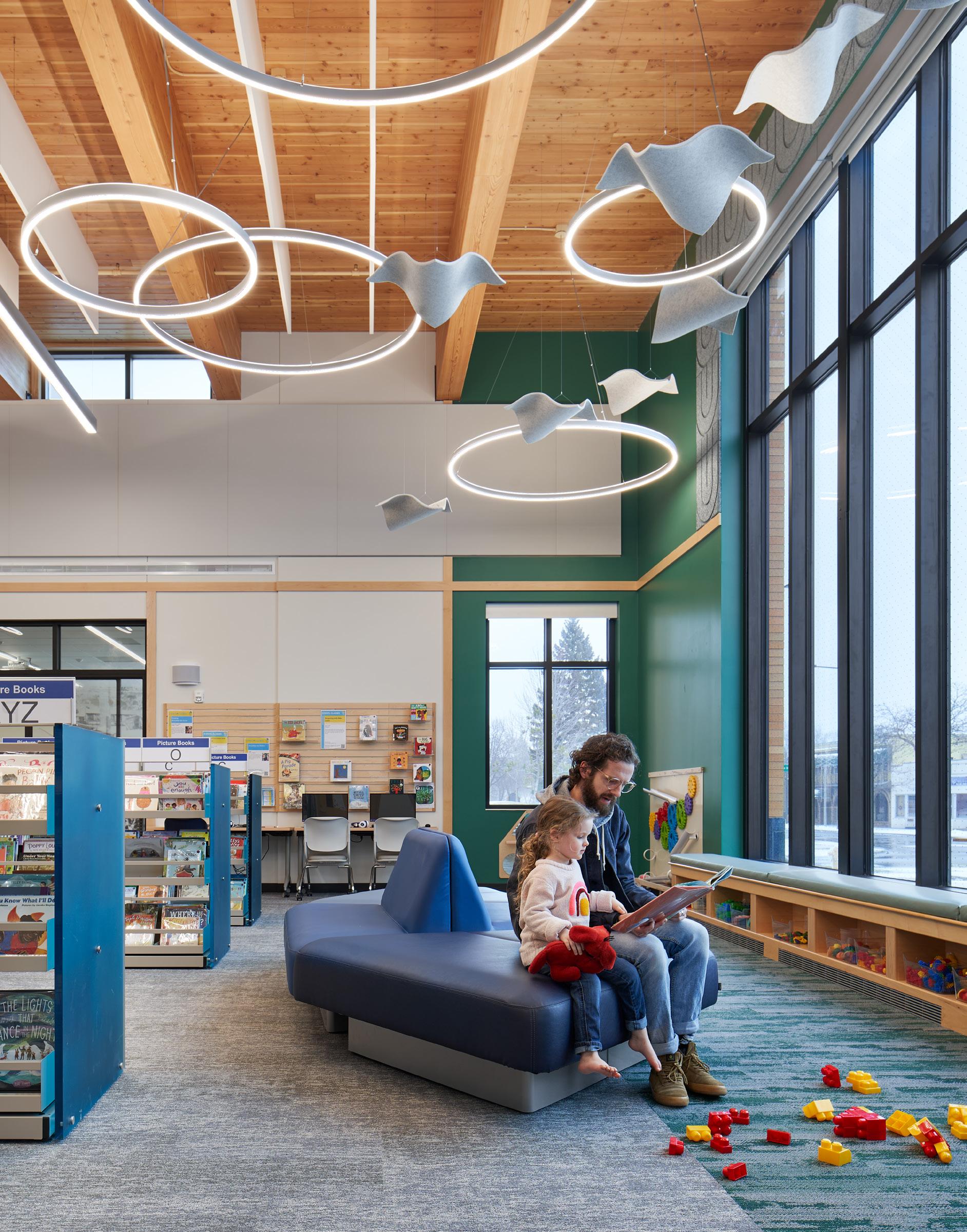 The project’s goals and objectives include: ensuring equitable and universal access to all library resources; providing a safe, welcoming, and inviting resource for users of all ages, providing spaces with near-term flexibility and long-term adaptability; accommodating the continuing evolution of library services; and the development of staff support spaces that respond to existing operational staffing (1 FTE). The modest facility provides dedicated spaces for each age range of reader, a storytime room connected to a secure outdoor reading area, multiple study rooms including one for use by the City as a “soft interview” room (available after library hours), a fireplace reading area, and the integration of a number of book art pieces that establish a strong sense of identity and character.
