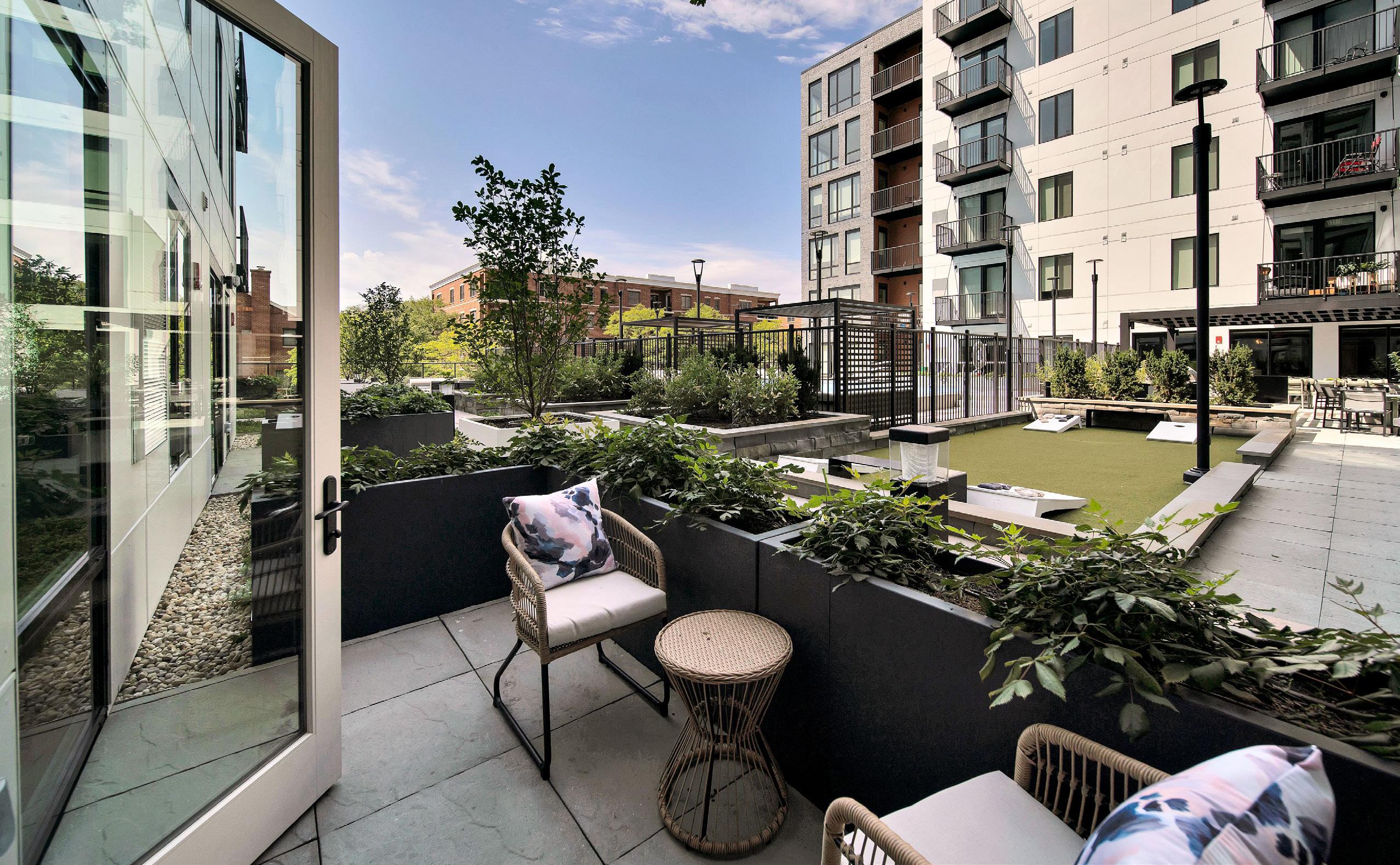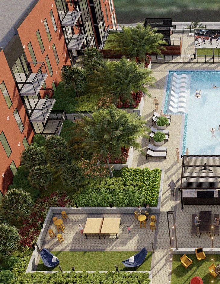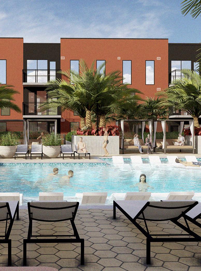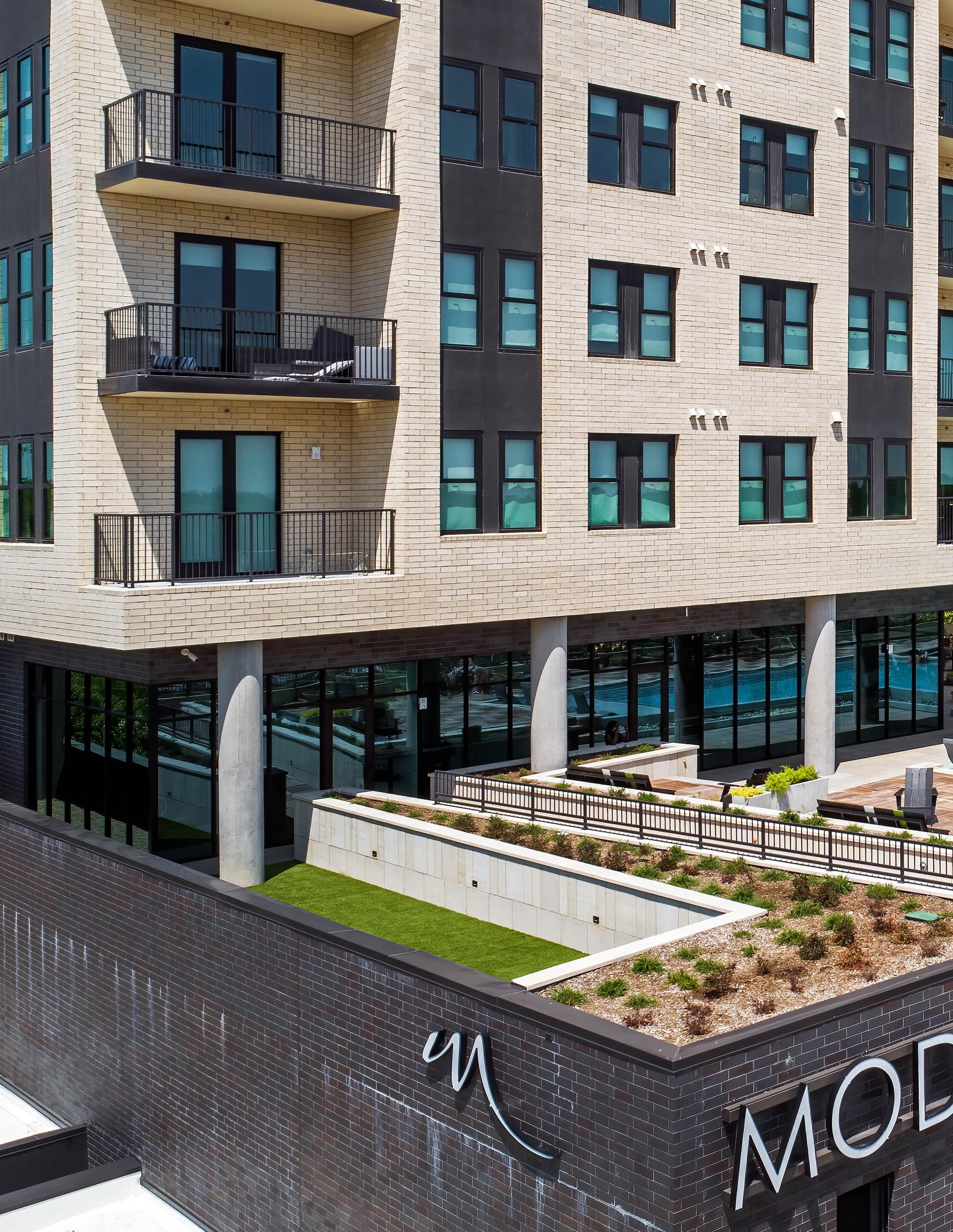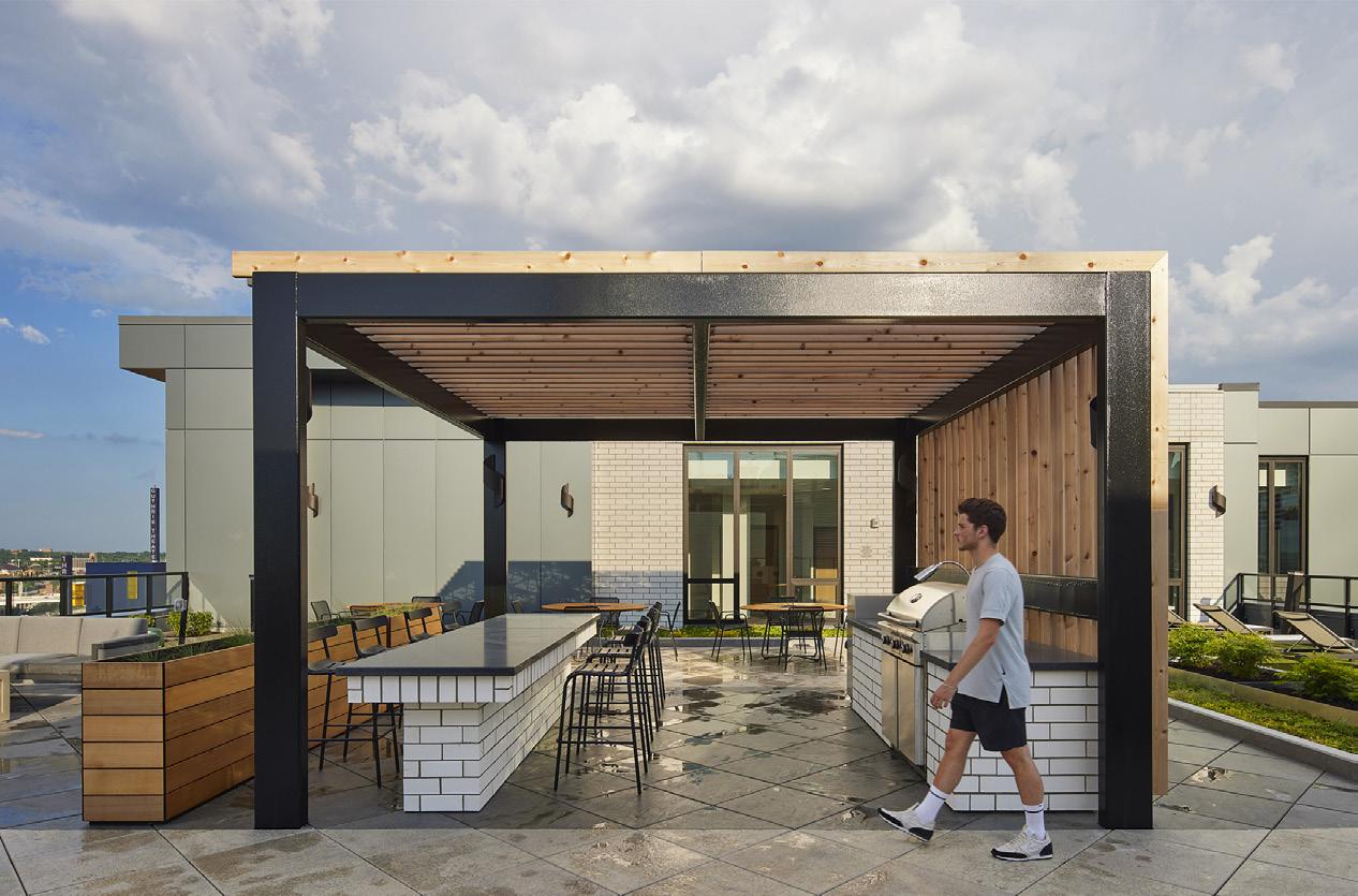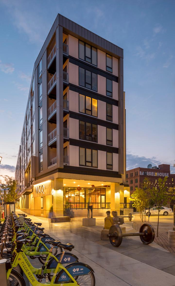 The exterior design took inspiration from the neighborhoods roots as the cities original public transit company’s, warehouse and street car factories. Red brick tones and black iron detailing pay homage to the blacksmiths, carpenters and trolley cars that formed the original district. With modern amenities and conveniences expected by students, the property was designed to feel like it has always been there.