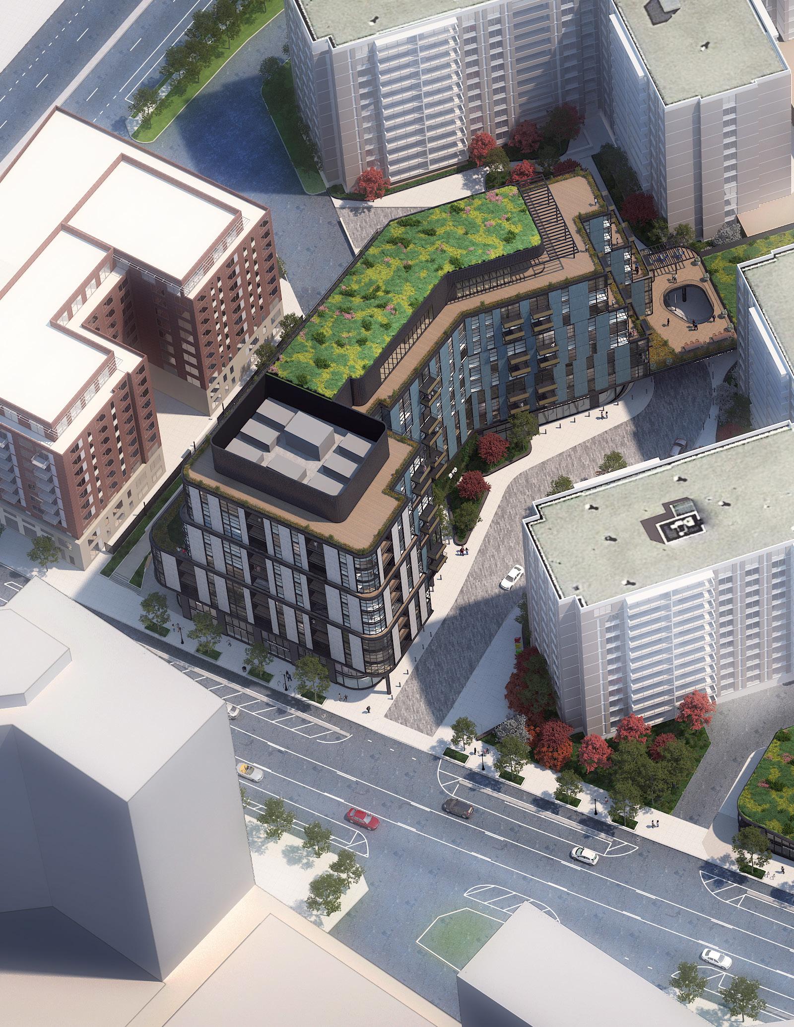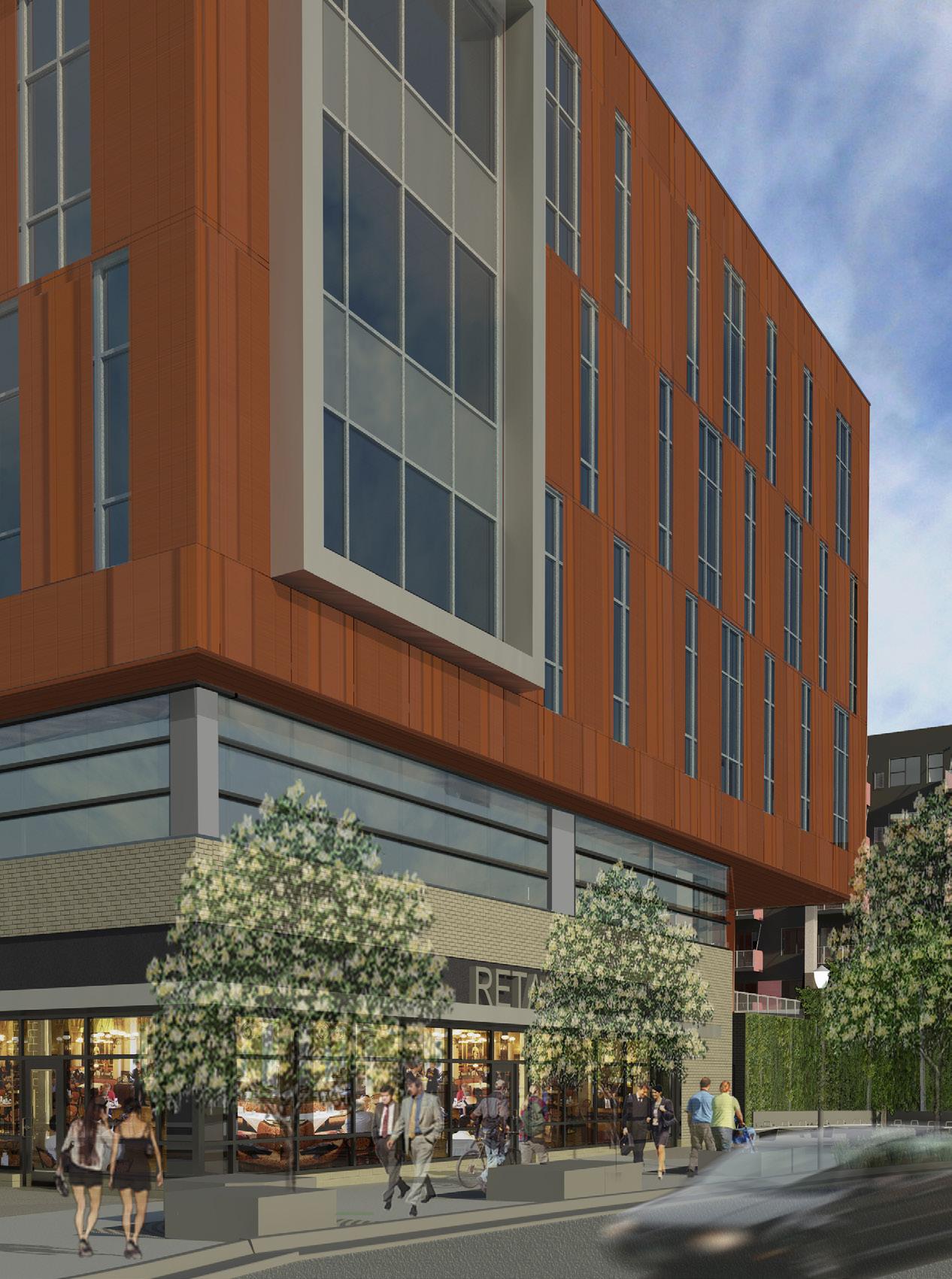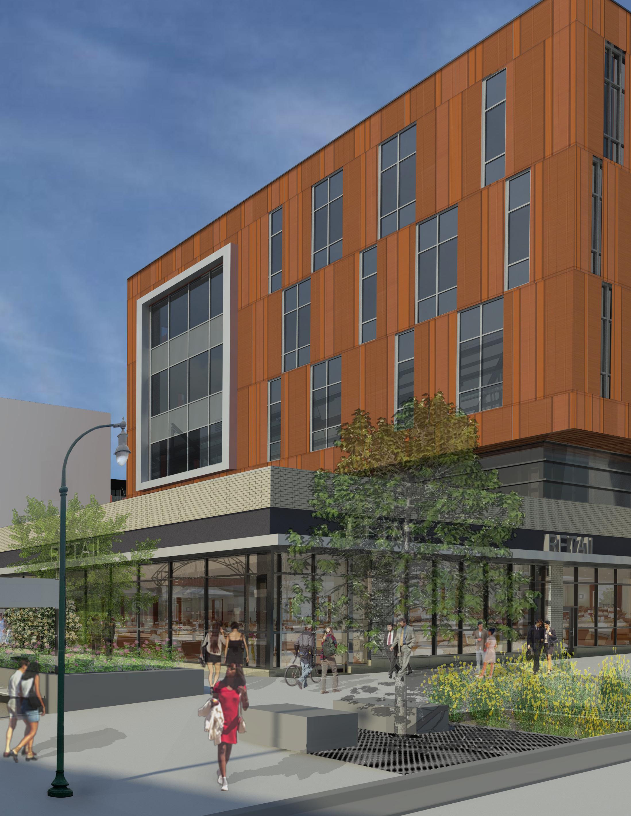The design of the building will create an urban corner with groundlevel leasing and amenity spaces facing the north and northeast corner. Also, along the north side adjoining property line, there will be a coffee lounge with additional amenity spaces, and the exterior structure consisting of terracotta, porcelain tile, metal panels, and glass. The form of the building relates to the height and scale of the surrounding context and the configuration of the building allows for expressions of horizontally and vertically designed building footprint, capped by an amenity deck on the seventh level to take advantage of views to the city.