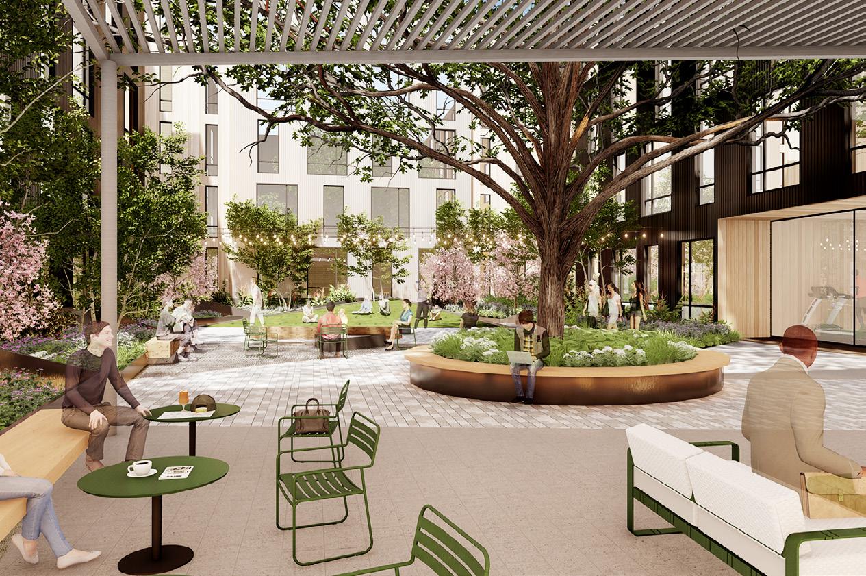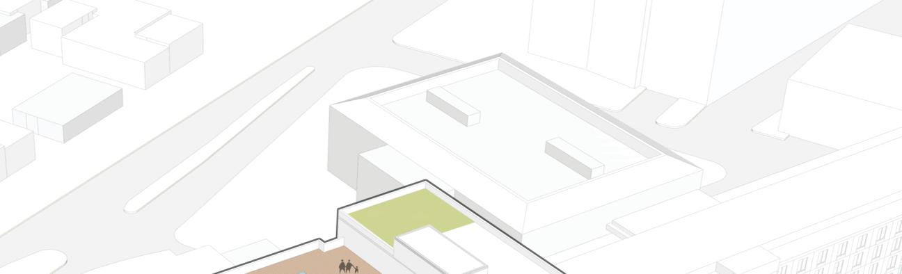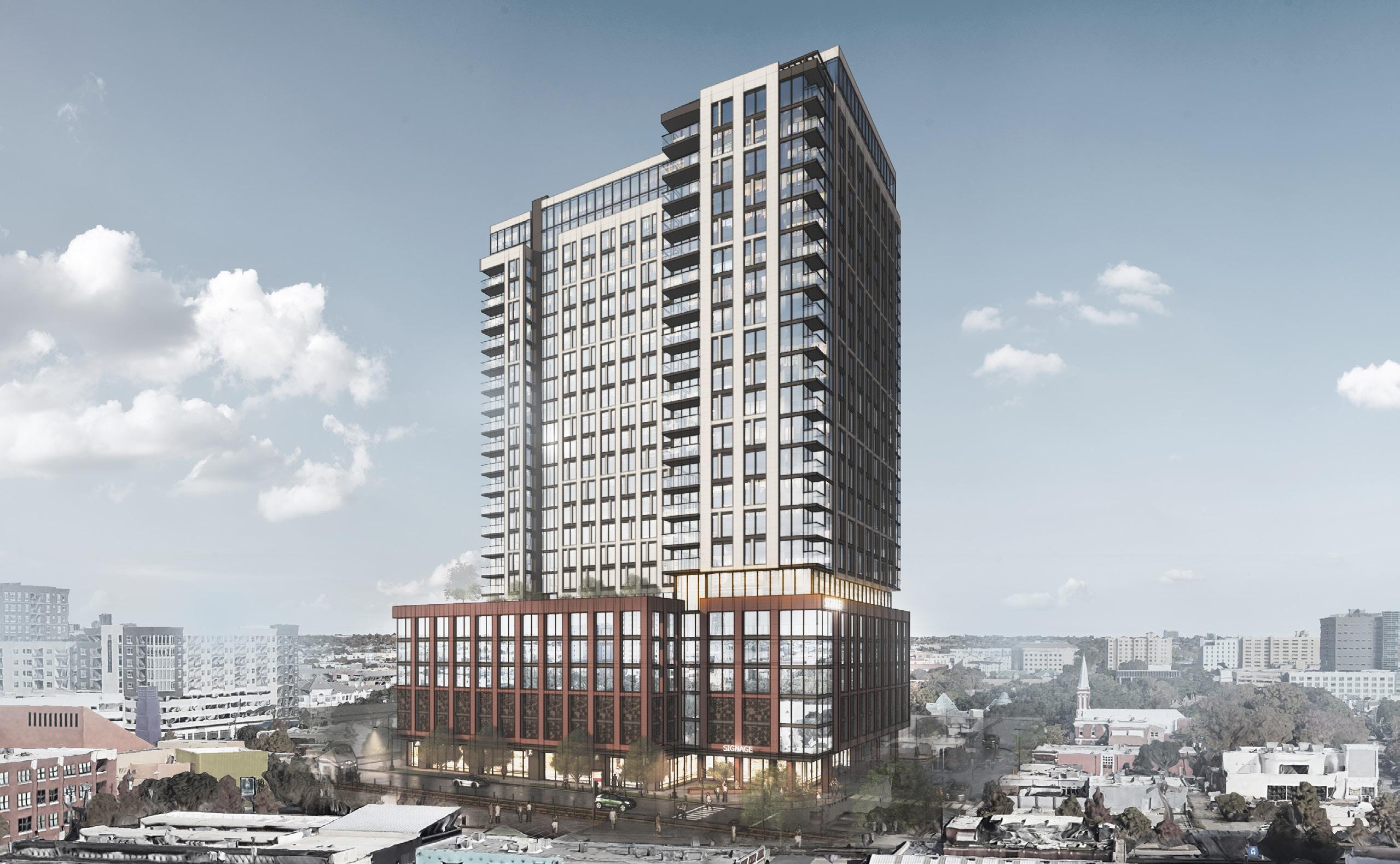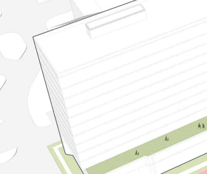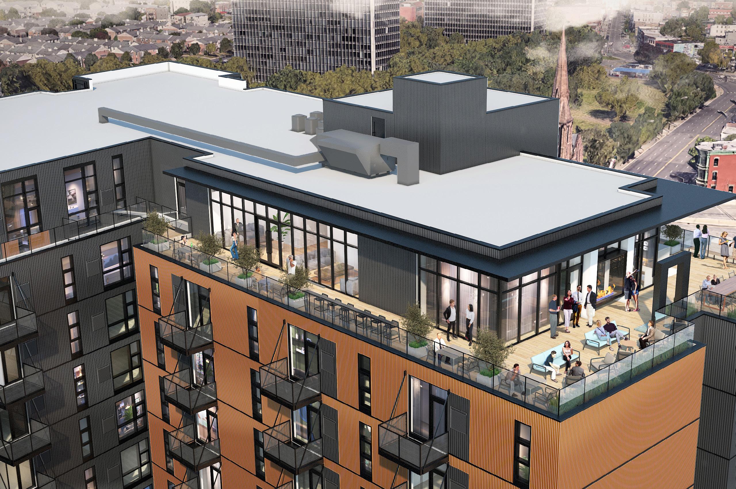 The design of the building will create an urban corner with groundlevel leasing and amenity spaces facing the north and northeast corner. Also, along the north side adjoining property line, there will be a coffee lounge with additional amenity spaces, and the exterior structure consisting of terracotta, porcelain tile, metal panels, and glass. The form of the building relates to the height and scale of the surrounding context and the configuration of the building allows for expressions of horizontally and vertically designed building footprint, capped by an amenity deck on the seventh level to take advantage of views to the city.
