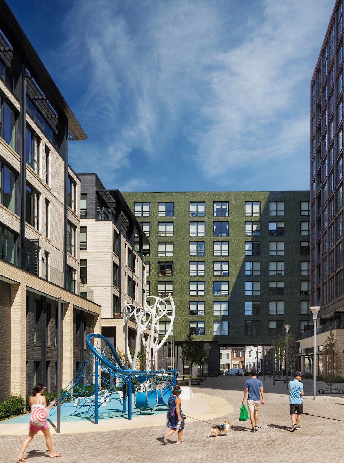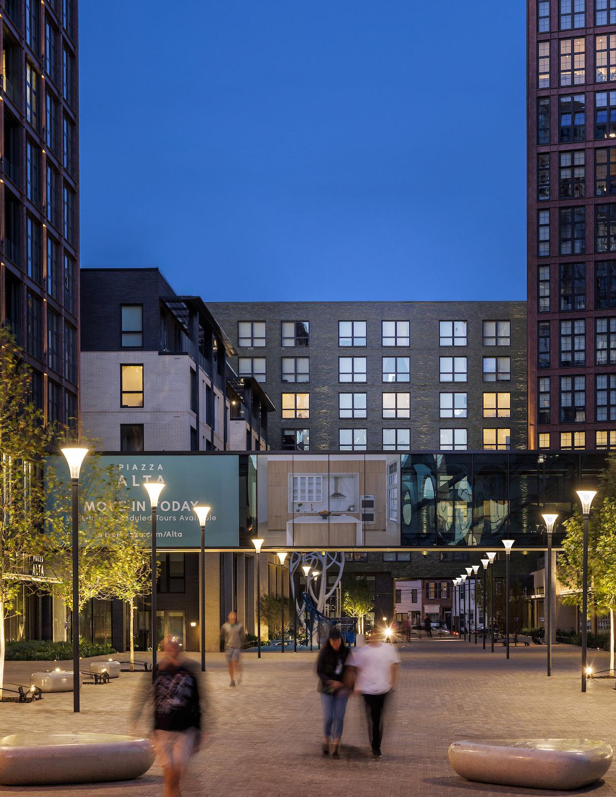 Located in Alexandria, Virginia, this innovative mixed-use development strategically connects office areas, residential neighborhoods, and a public school through a comprehensive design approach. Central to the project is a green hike-and-bike trail that encircles the site, forming a linear park that promotes biodiversity and pedestrian activity.