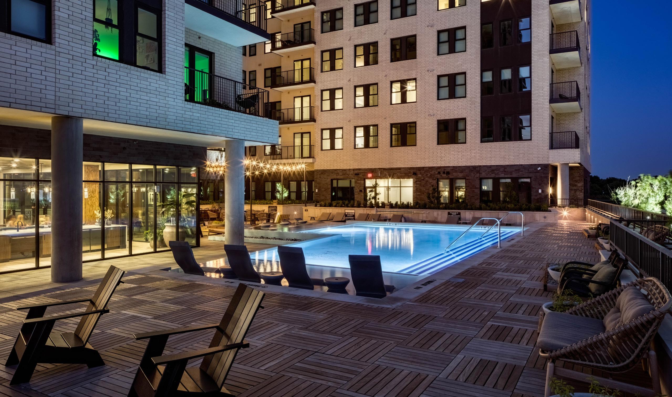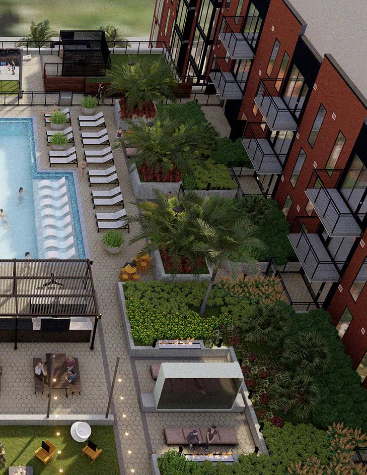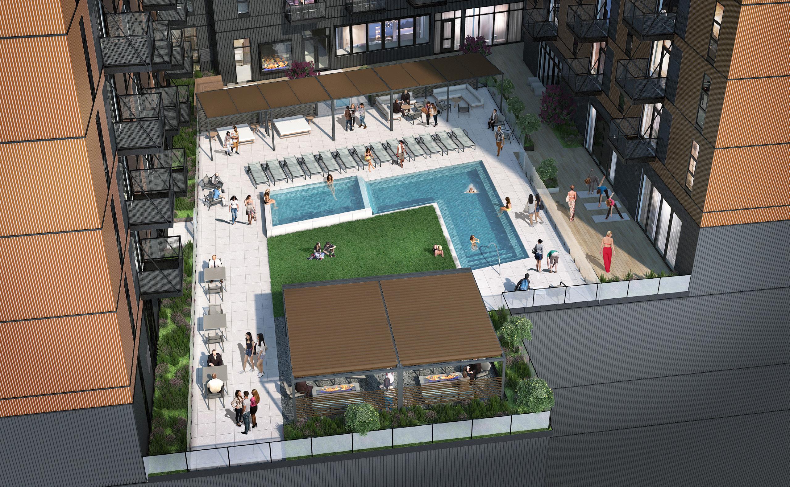 The project is designed to create an active street and pedestrian experience. By locating the fitness center, lobby/lounge, leasing offices, and bike lounge spaces along Addison Avenue, the first-floor parking and service spaces are concealed from view, apart from the lower level garage entry on the south end of the site. The second floor is set back from the property line along the north and south sides and is composed of residential units, a clubroom amenity space and a landscaped terrace with an outdoor pool, individual unit terraces, and other outdoor amenities. Levels 3-7 are the typical residential levels, with the 8th-floor setback from the street, north, and south property lines creating terraces for the top-level units.