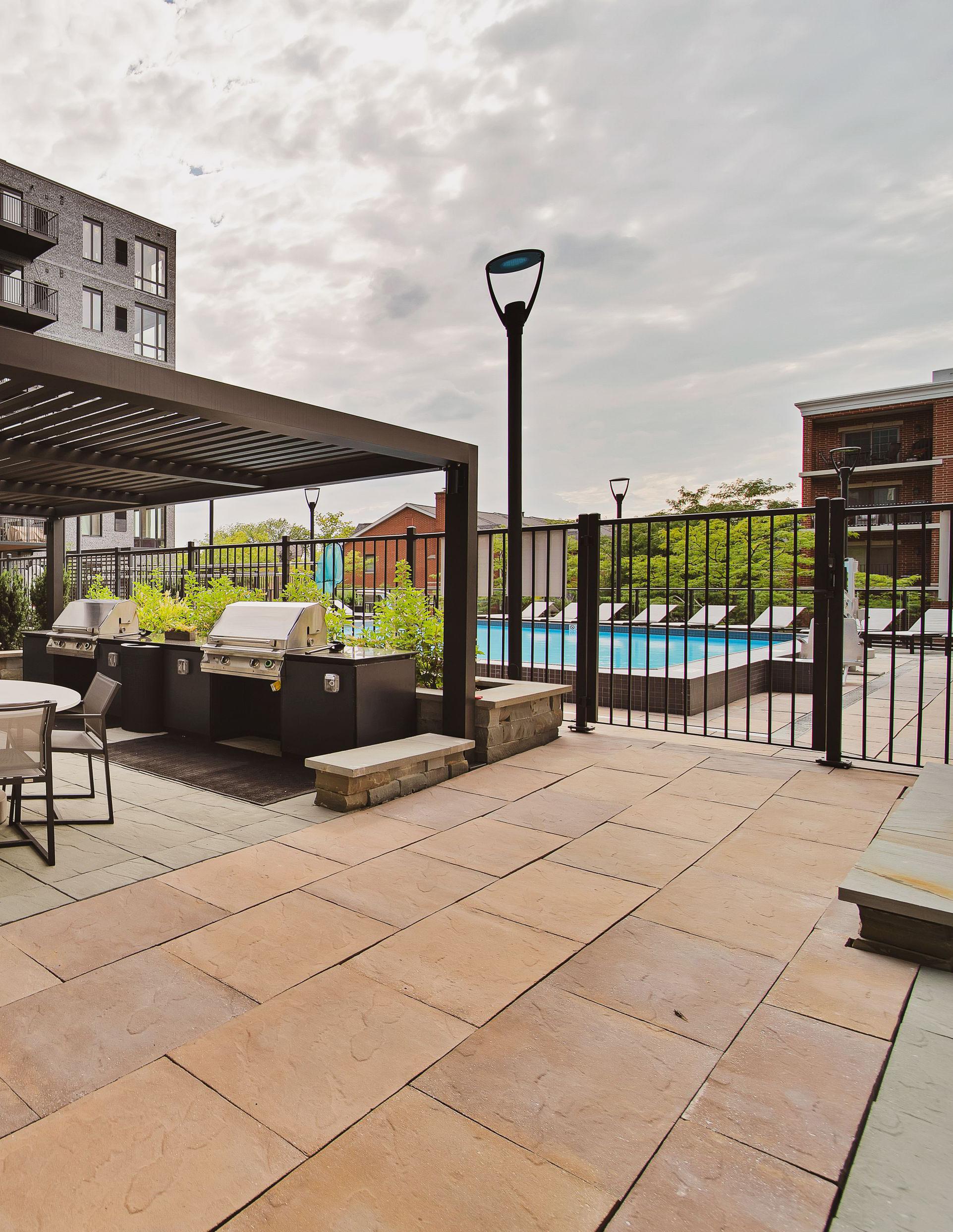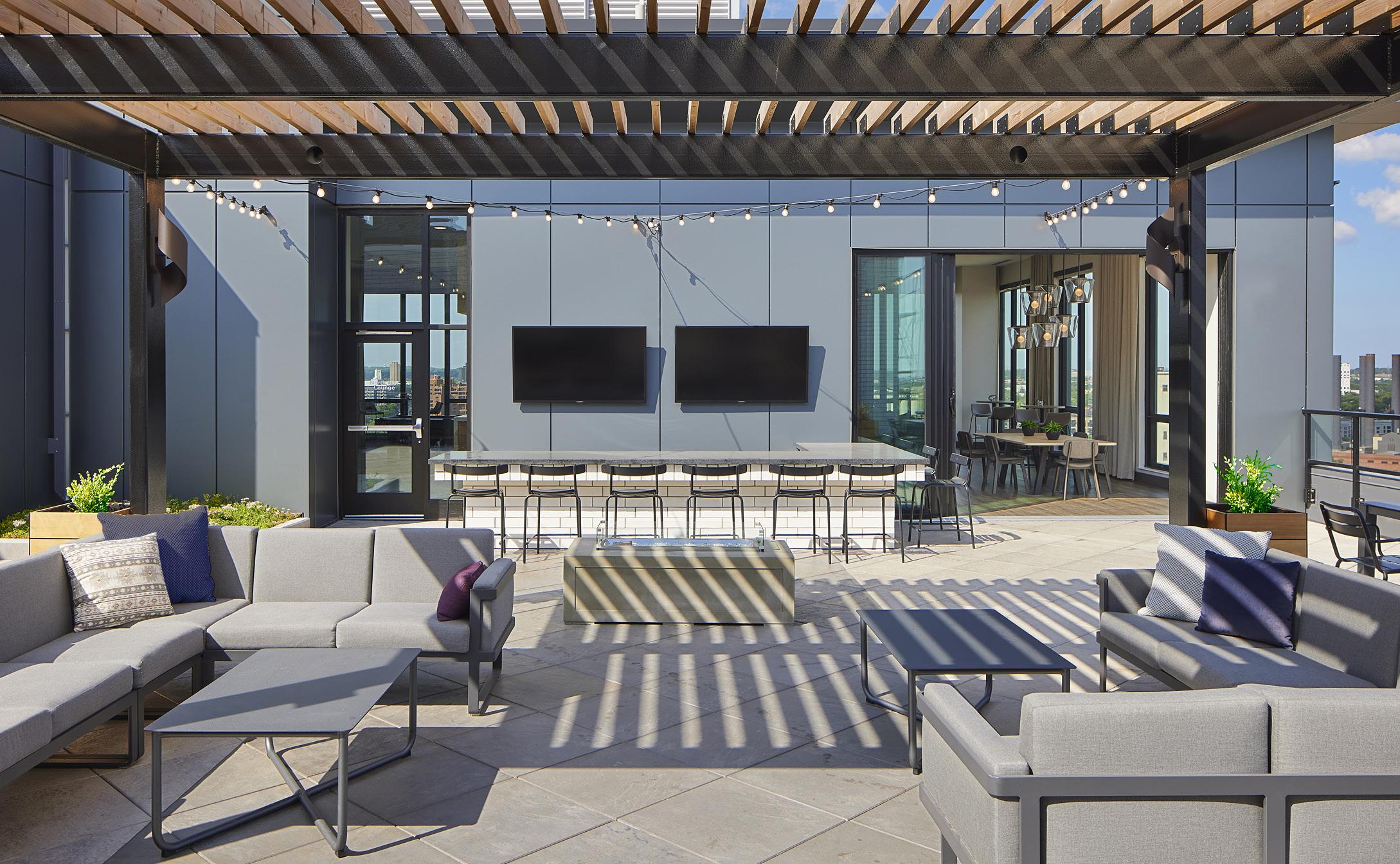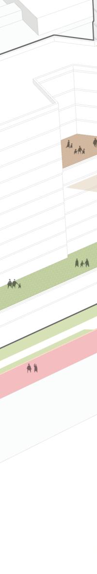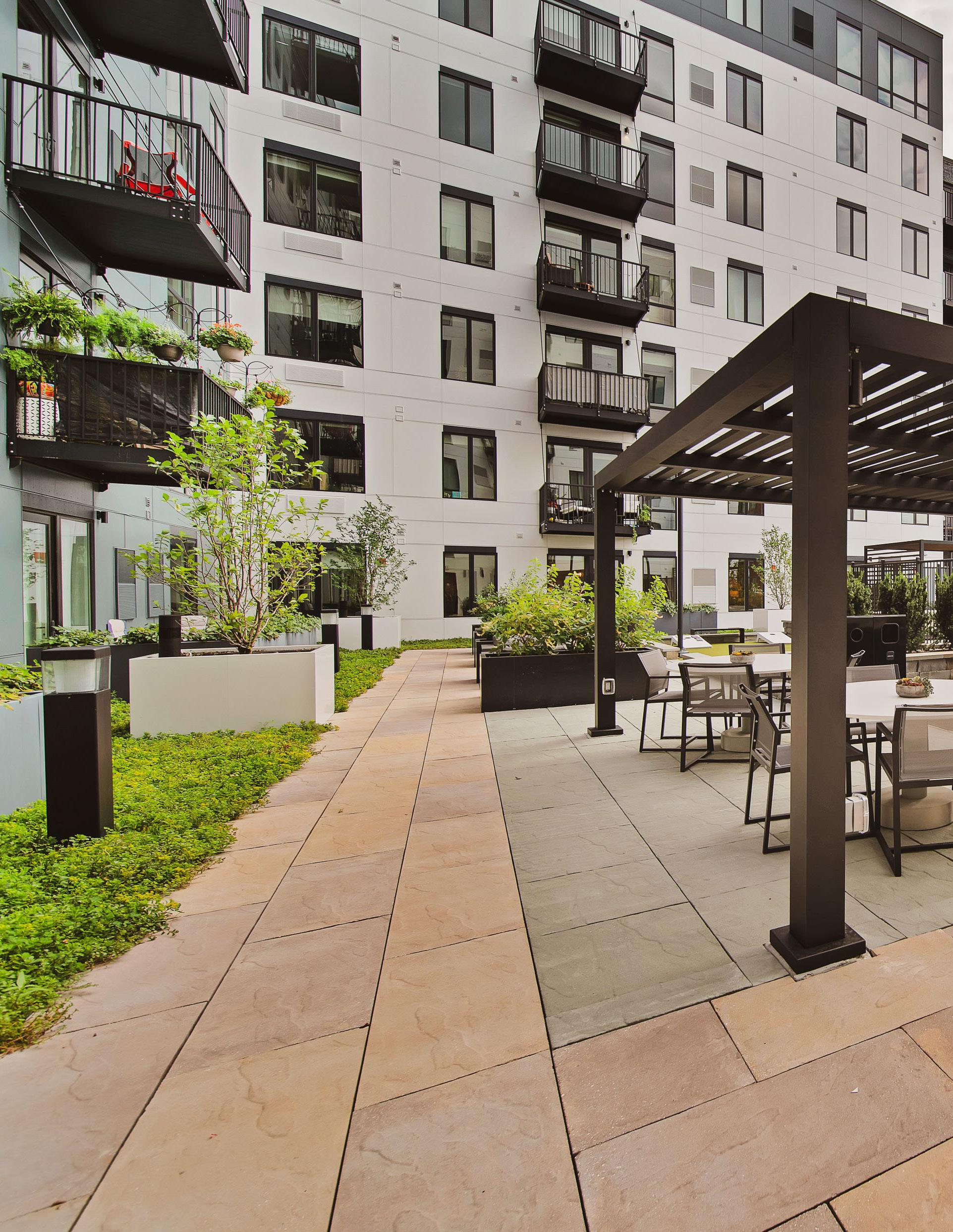 The project is designed to create an active street and pedestrian experience. By locating the fitness center, lobby/lounge, leasing offices, and bike lounge spaces along Addison Avenue, the first-floor parking and service spaces are concealed from view, apart from the lower level garage entry on the south end of the site. The second floor is set back from the property line along the north and south sides and is composed of residential units, a clubroom amenity space and a landscaped terrace with an outdoor pool, individual unit terraces, and other outdoor amenities. Levels 3-7 are the typical residential levels, with the 8th-floor setback from the street, north, and south property lines creating terraces for the top-level units.