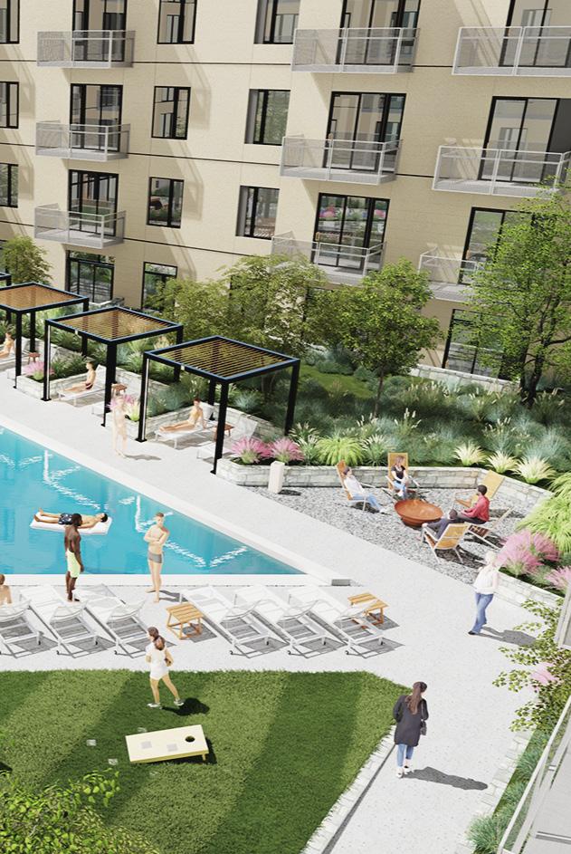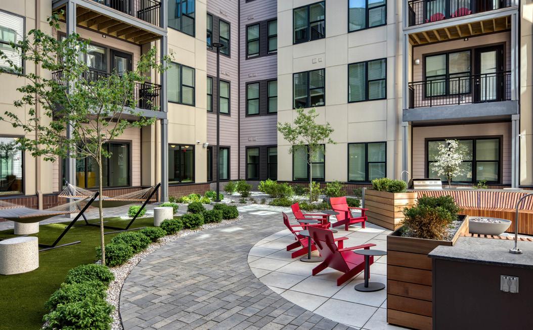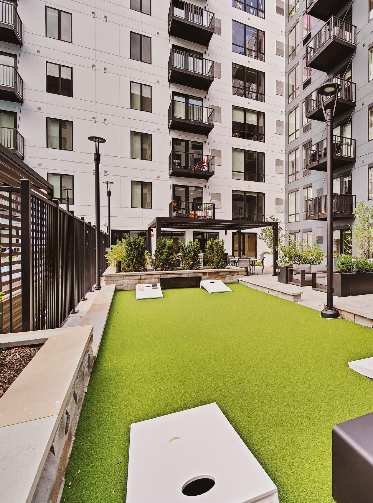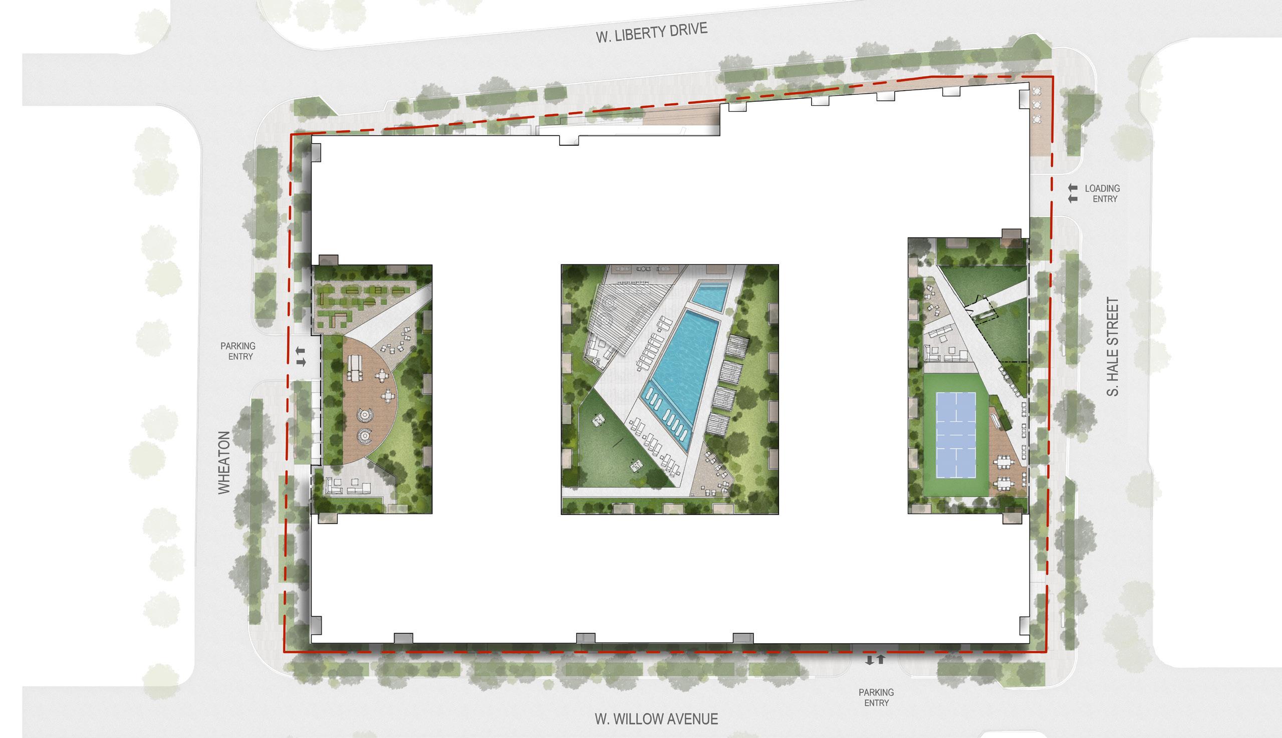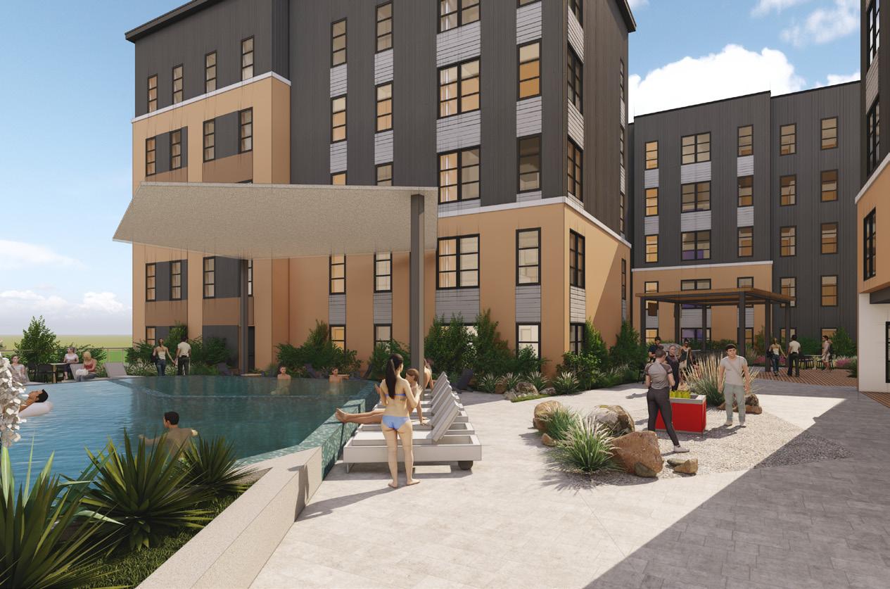 The Standard at Bloomington incorporates 439 units and 1,064 beds within three residential buildings. Amenity spaces will include a lobby, clubroom, fitness, study areas, business center, mail, basketball court, and facility leasing/management space. Outdoor amenities will include a shared outdoor courtyard with amenities such as outdoor patio, pool, firepit, grilling stations, bar, trellis, private walk-out patios and landscaping.