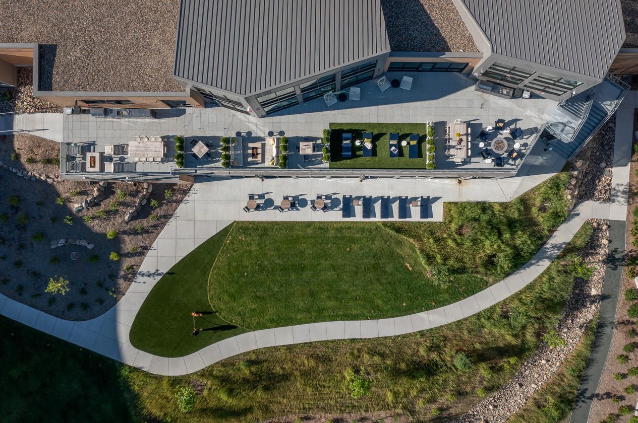 Between the two structures a dynamic courtyard has been created as a contemporary oasis for residents and their guests to enjoy. Designed to maximize mountain views, the courtyard benefits from southern sun exposure. It has no right angles allowing for a variety of gathering spaces and outdoor living rooms.